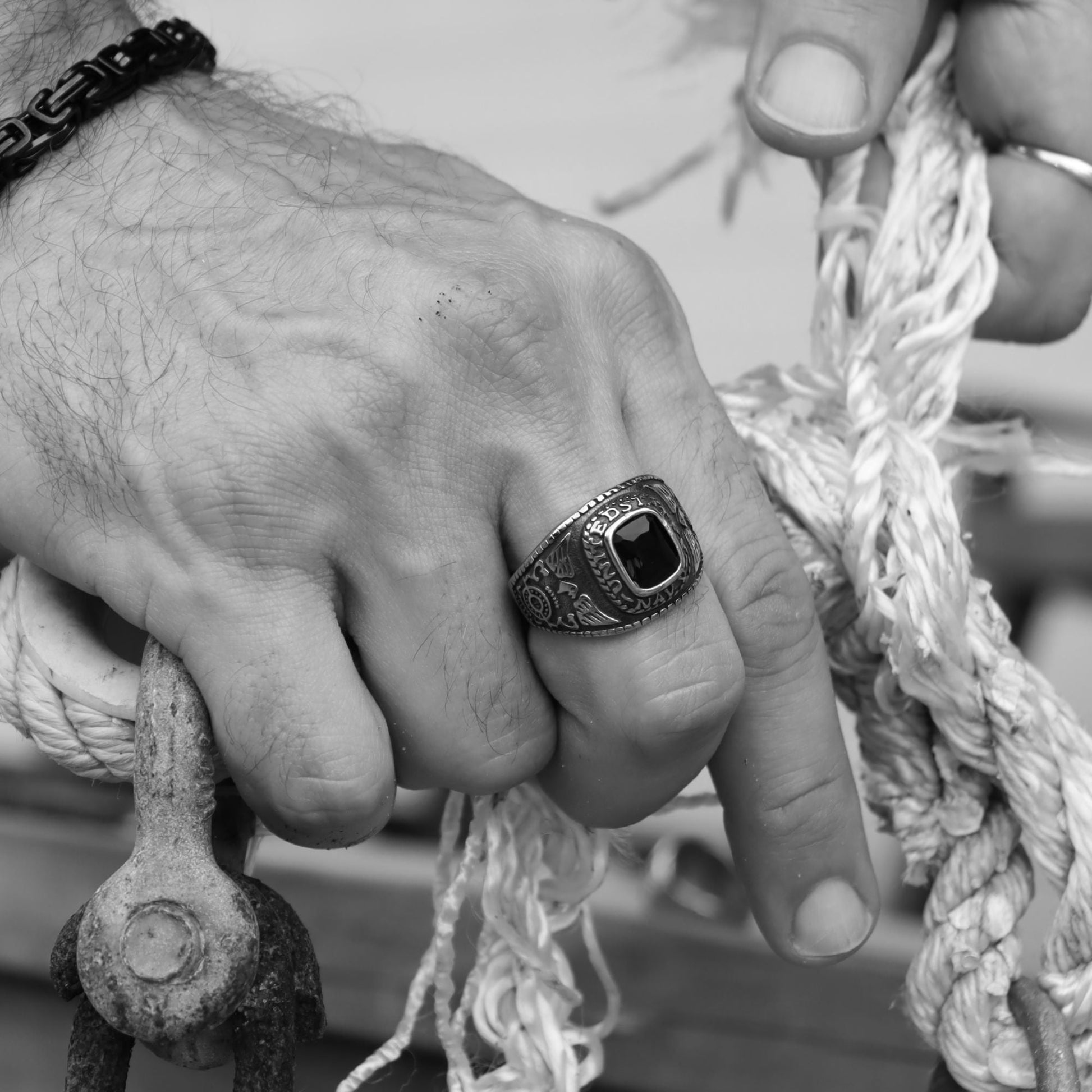 The United States Military Blue Stone Navy Ring  from our Military Collection is custom molded and cast with a premium blend of surgical stainless steel that offers enhanced durability, even after exhaustive wear. The stainless steel Blue Stone Navy Ring features a deep blue ocean inspired stone centerpiece with a detailed eagle sigil on both sides of the ring. This ring is a bulkier styled ring that is great for men who want a classic everyday ring or a veteran who wants a memorable keepsake to help them remember their time served in the United States Navy. Whether you treat yourself or a loved one in the US Navy, this ring will make a standout addition in any jewelry collection!