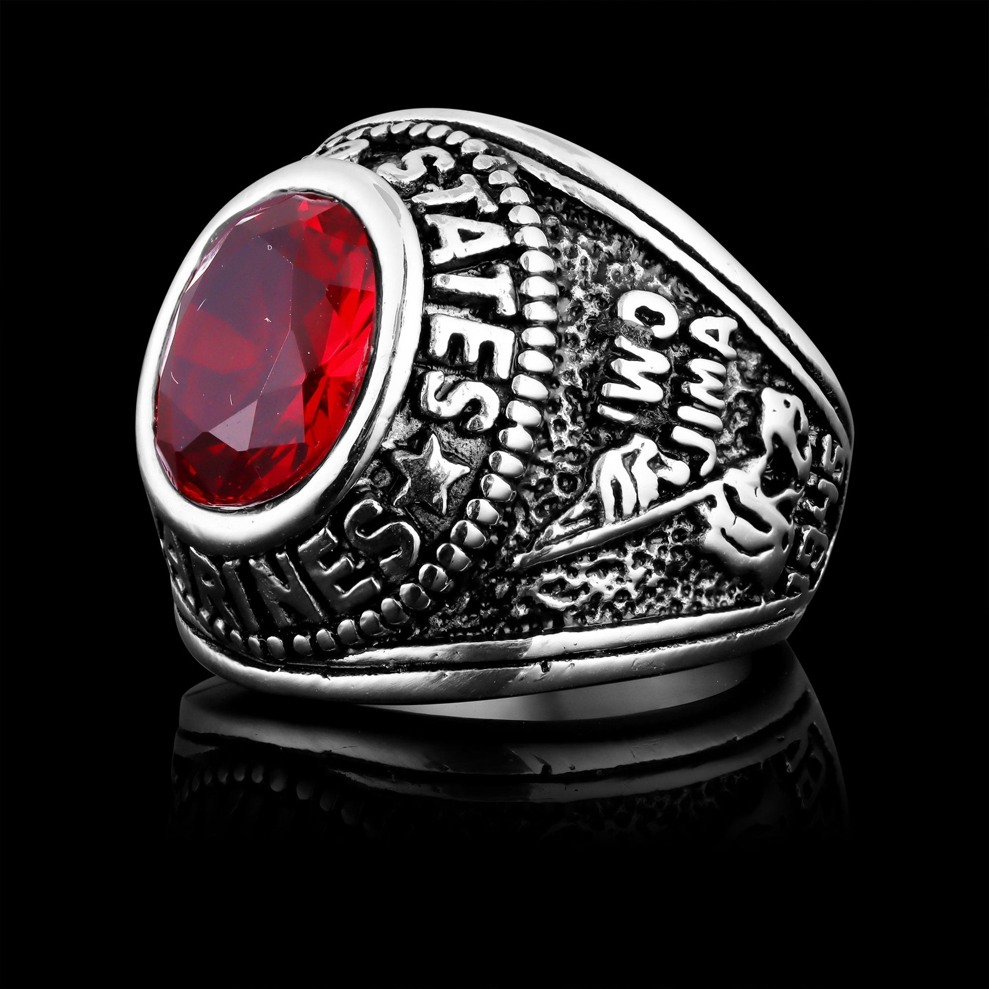 The United States Military Red Stone Marine Corp Ring from our Military Collection is custom molded and cast with a premium blend of surgical stainless steel that offers enhanced durability, even after exhaustive wear. The stainless steel Red Stone US Marine Corp Ring features a red stone centerpiece with a detailed designs on both sides of the ring. This ring is a bulkier styled ring that is great for men who want a classic everyday ring or a veteran who wants a memorable keepsake to help them remember their time served in the United States Marine Corp. Whether you treat yourself or a loved one in the United States Marine Corp, this ring is a great choice.