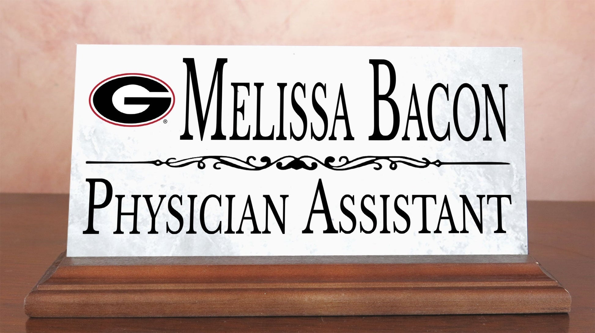Celebrate your Bulldog pride with this University of Georgia custom marble desk nameplate. Featuring the official Georgia “G” logo and your personalized name and title, this 8" x 4" plaque is a sophisticated way to showcase your professional success and school spirit.