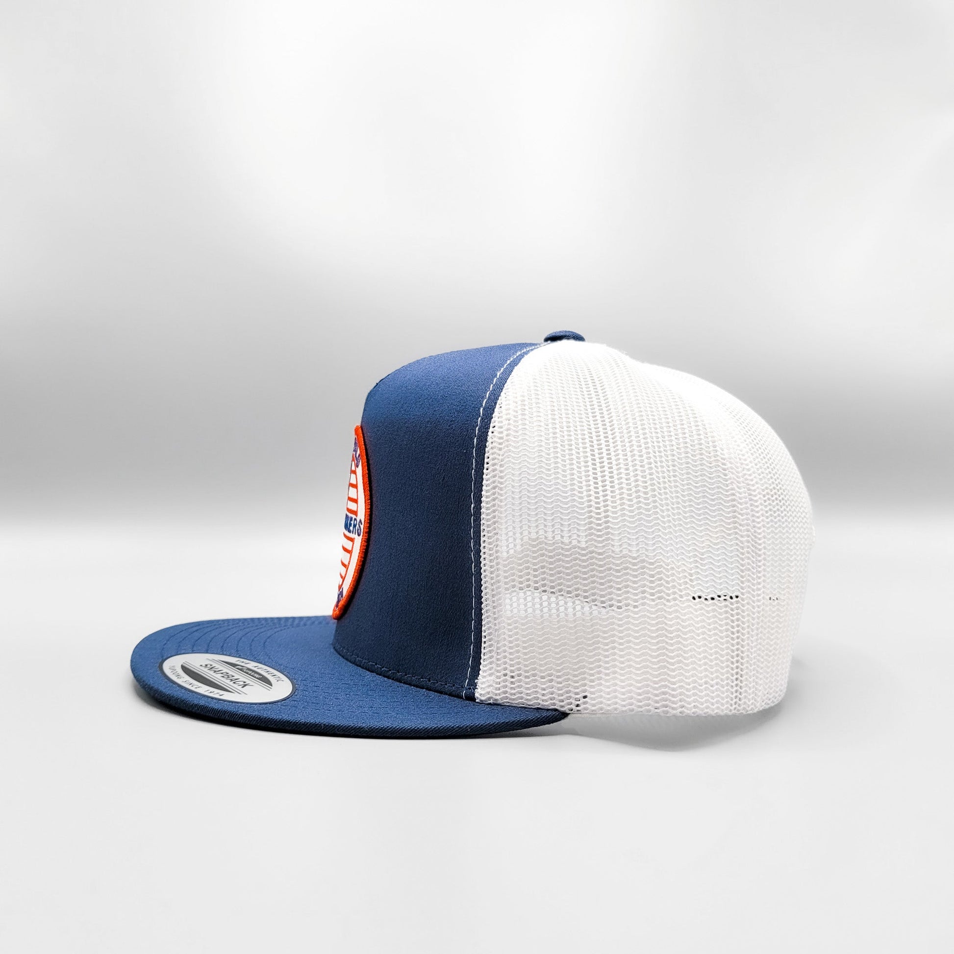 This is a retro American Iron Workers "We Build America" embroidered logo patch in red, white and blue on one of our best selling trucker hats -- a Yupoong 6006 Classic mesh snapback trucker hat.