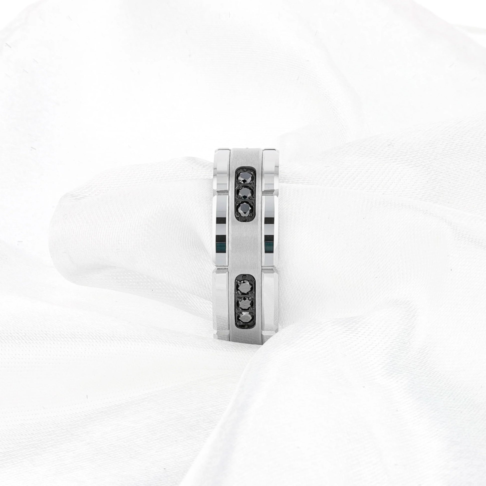 This bold Thorsten Tungsten Carbide ring has a grooved band with polished notches a marvelous silver inlay with inset stunning round-cut, black diamonds. The ring’s nine black diamonds encircle the ring halfway in groups of three.