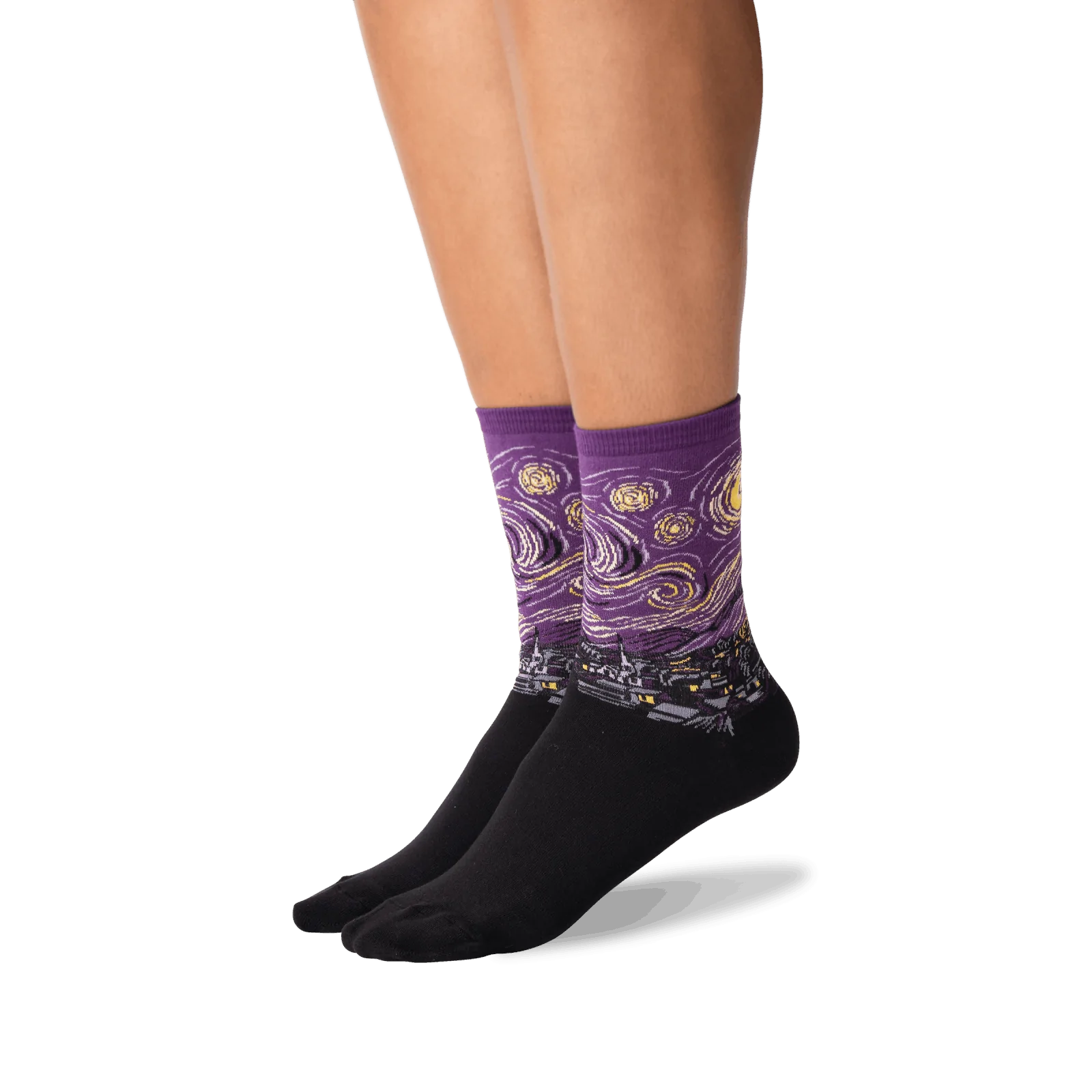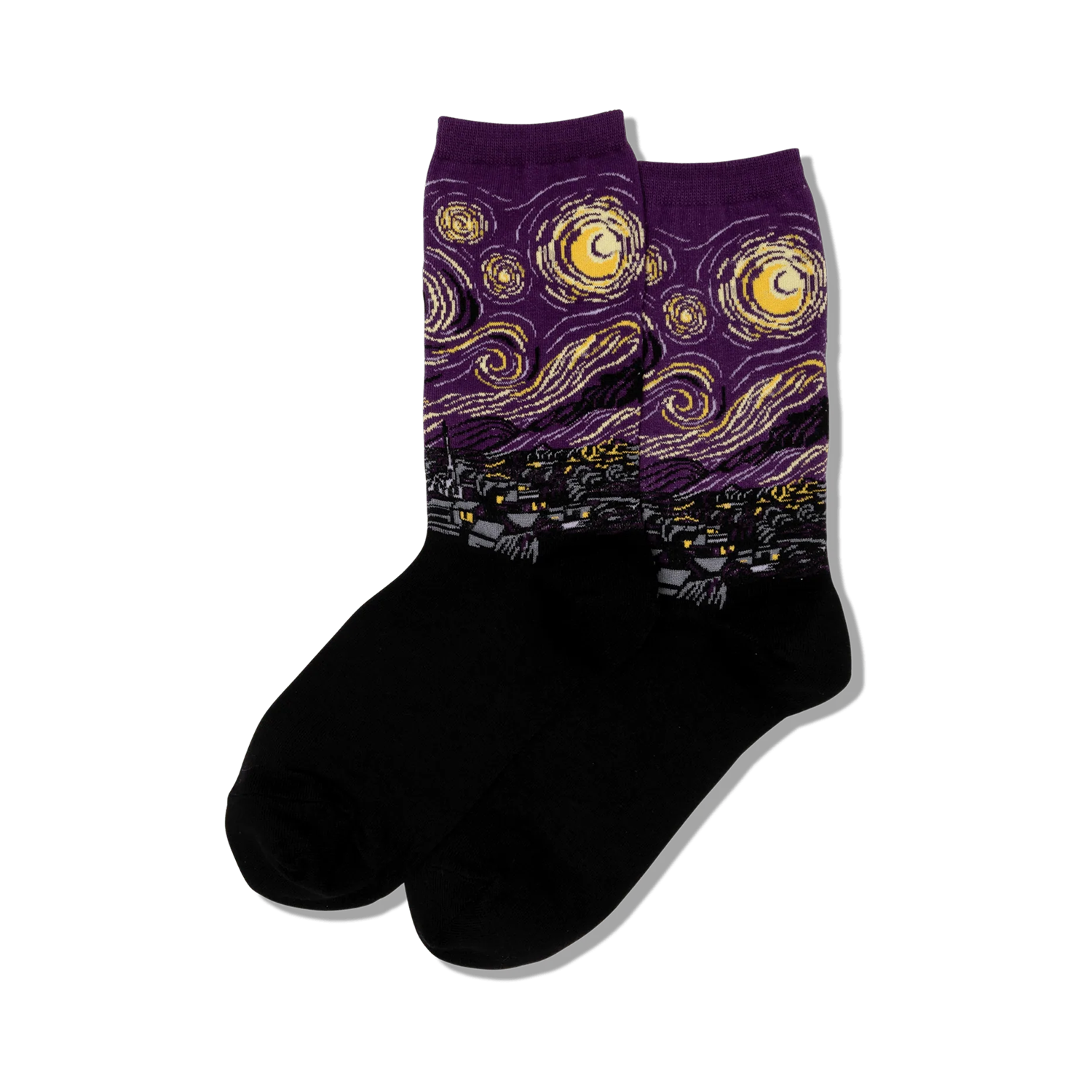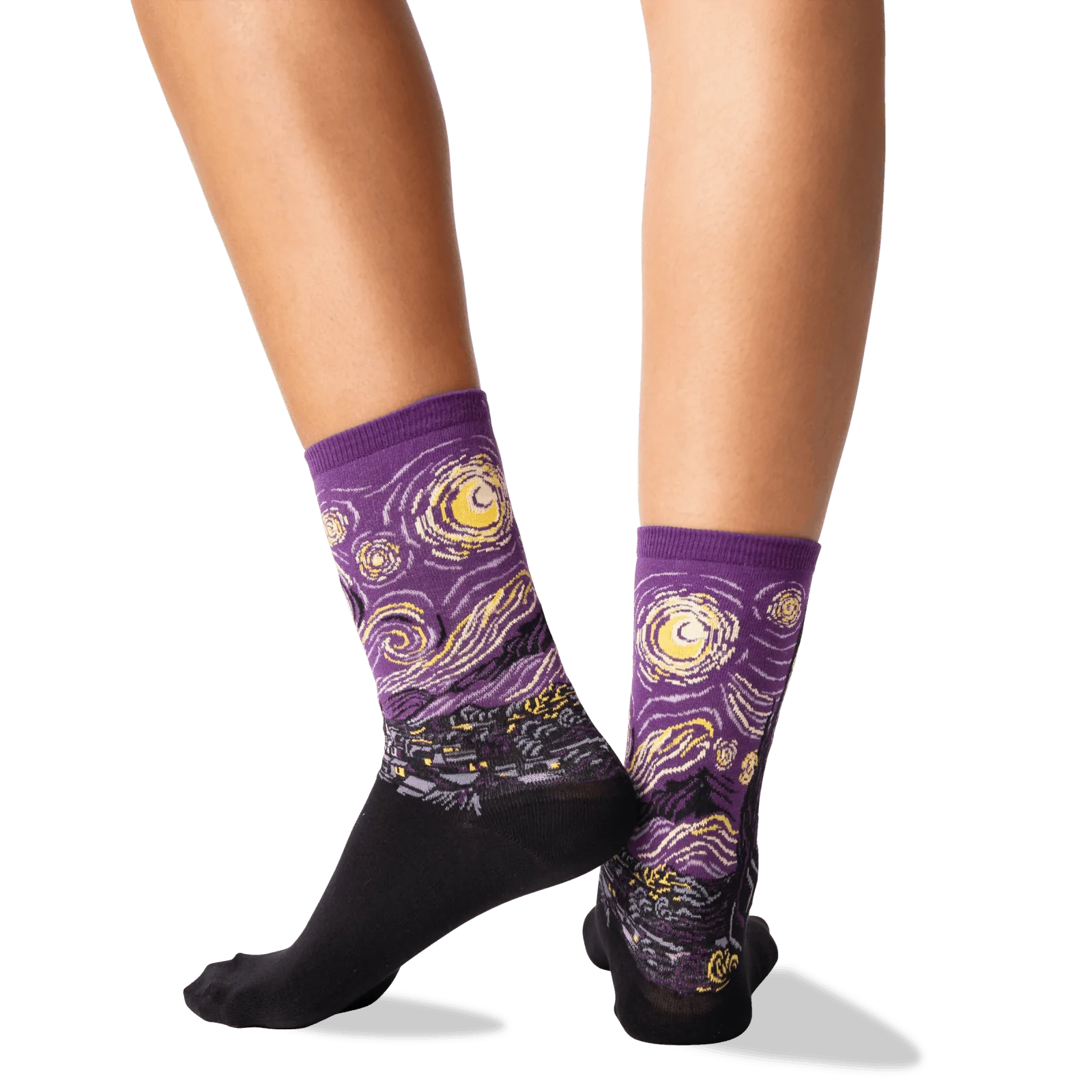 Embrace the night with one of the most iconic works of art in history by Vincent van Gogh. Each pair of black and gray crew socks features a stunning replica of Starry Night that starts at the ankle and goes to the cuff. Let the stars of the night guide you!
