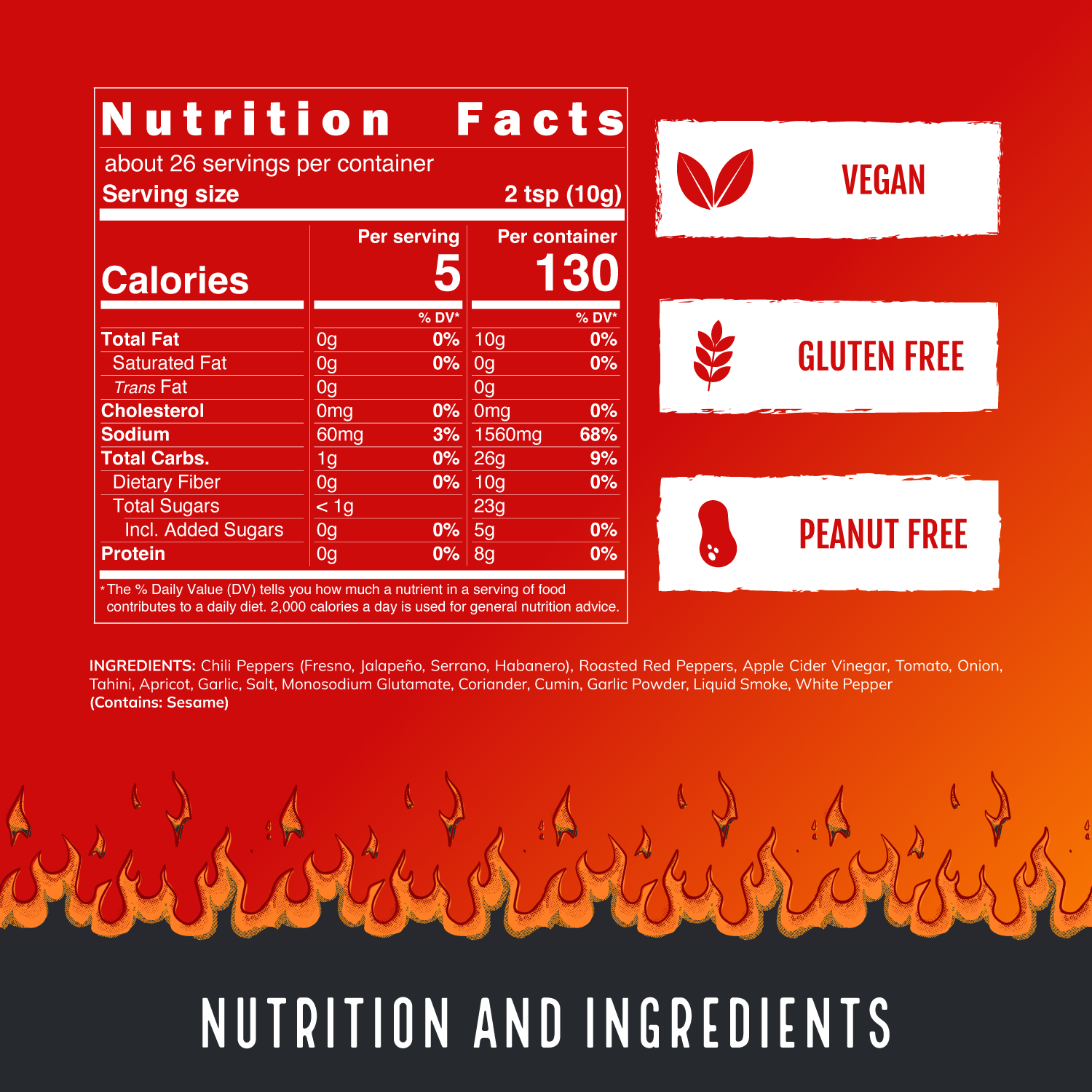 Roasted red peppers, earthy tahini, and Mediterranean spices create wing perfection straight from the bottle. The heat sneaks up on you, building with each bite. Customers call it their all-time favorite.