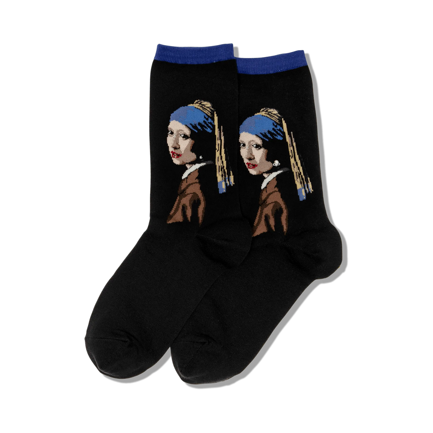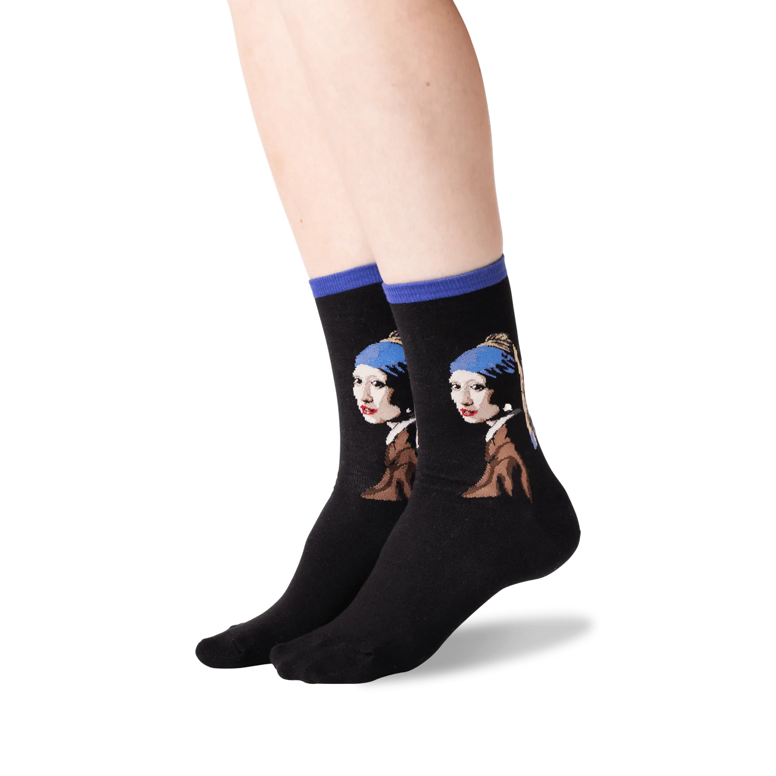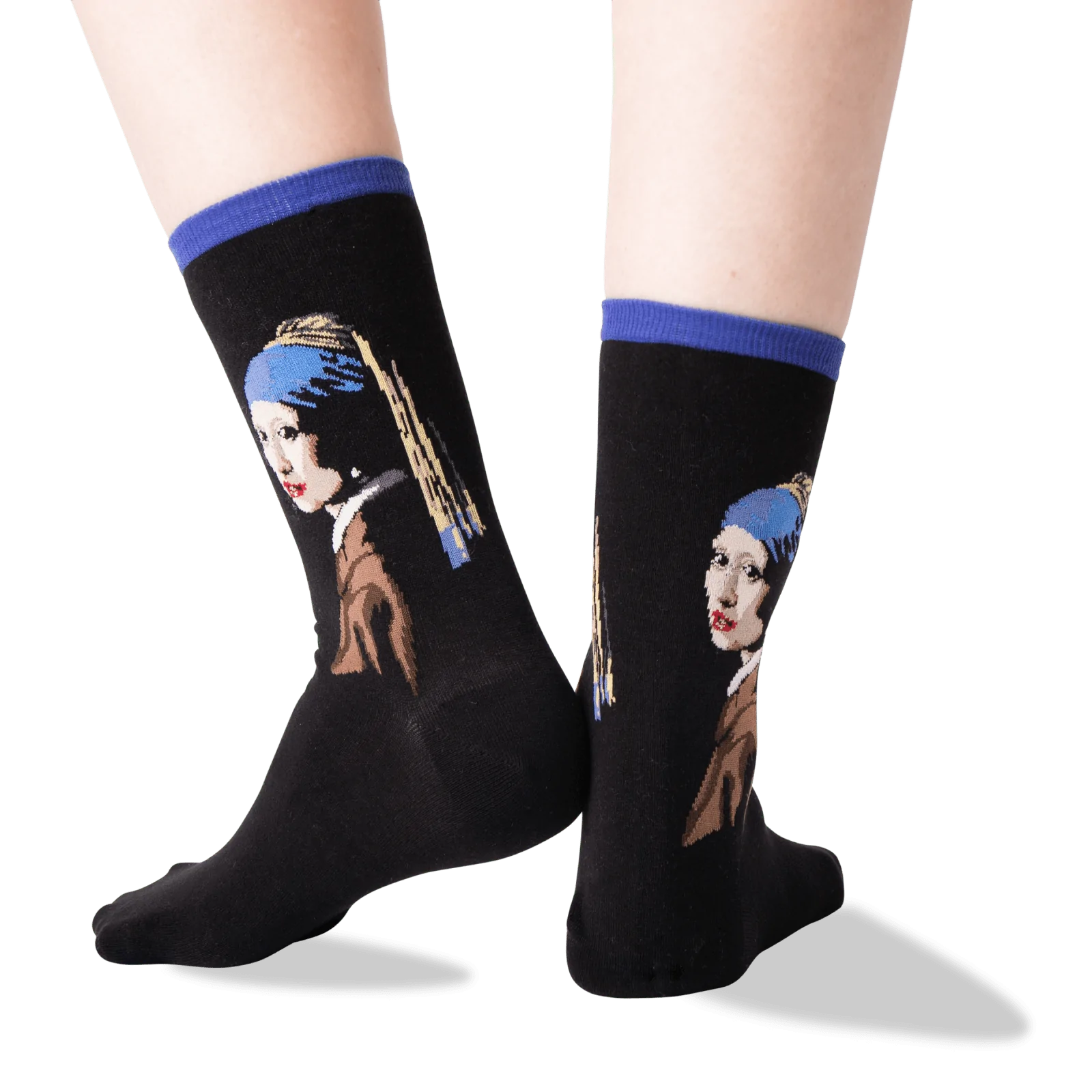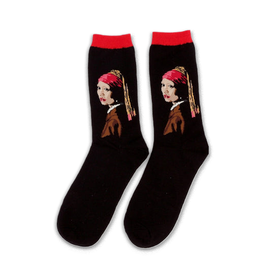 The Dutch Golden Age was known for classic pieces of art that really captivate people even all these years later. This beautiful pair of black crew socks features one of Johannes Vermeer's most iconic works of art, Girl with a Pearl Earring. Any art lover must have a pair of these cool socks in their sock drawer. Wear these fun socks to the art show or art class.