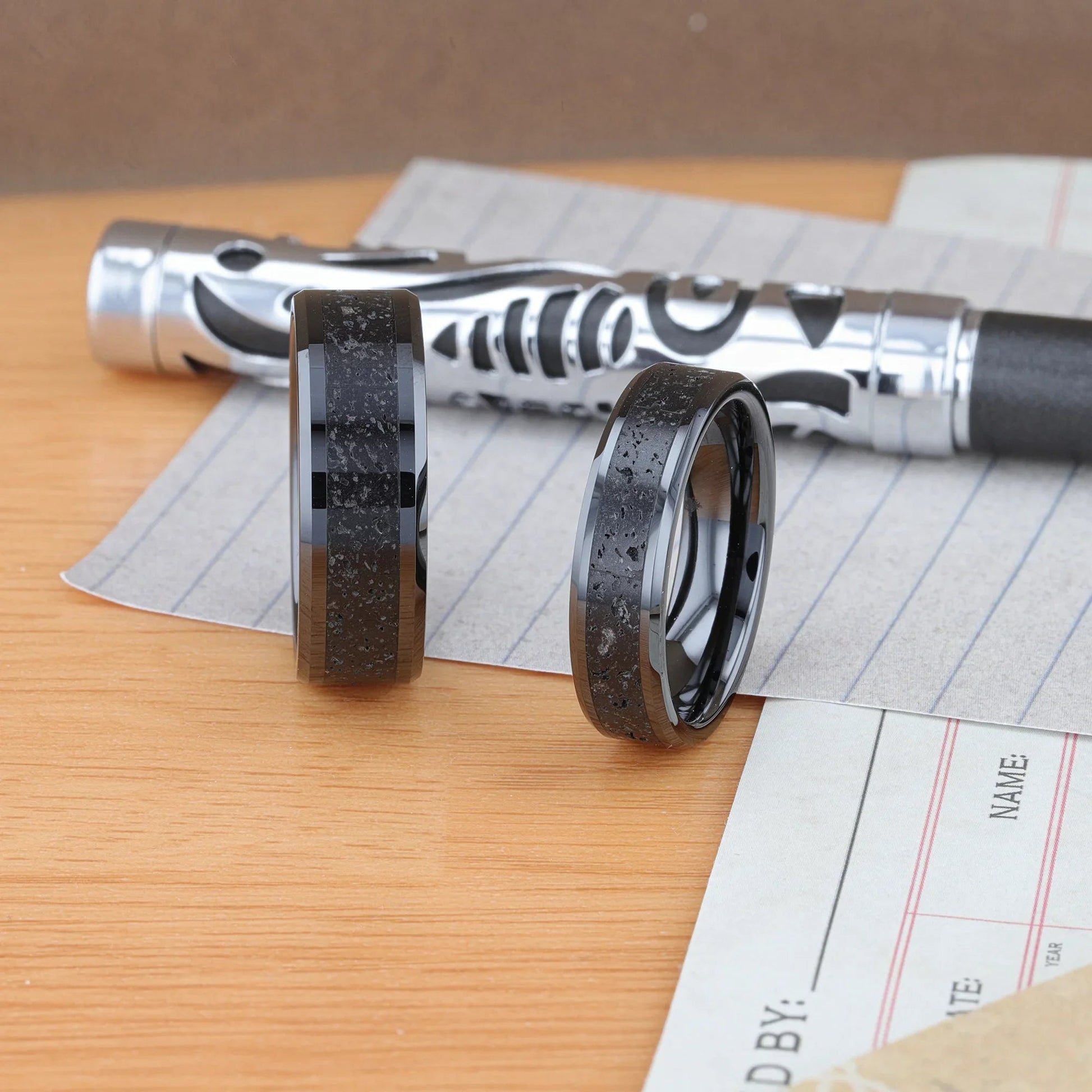 VESUVIUS Men’s Polished Black Ceramic Wedding Band with Black & Gray Lava Rock Stone Inlay & Polished Beveled Edges - 6mm & 8mm