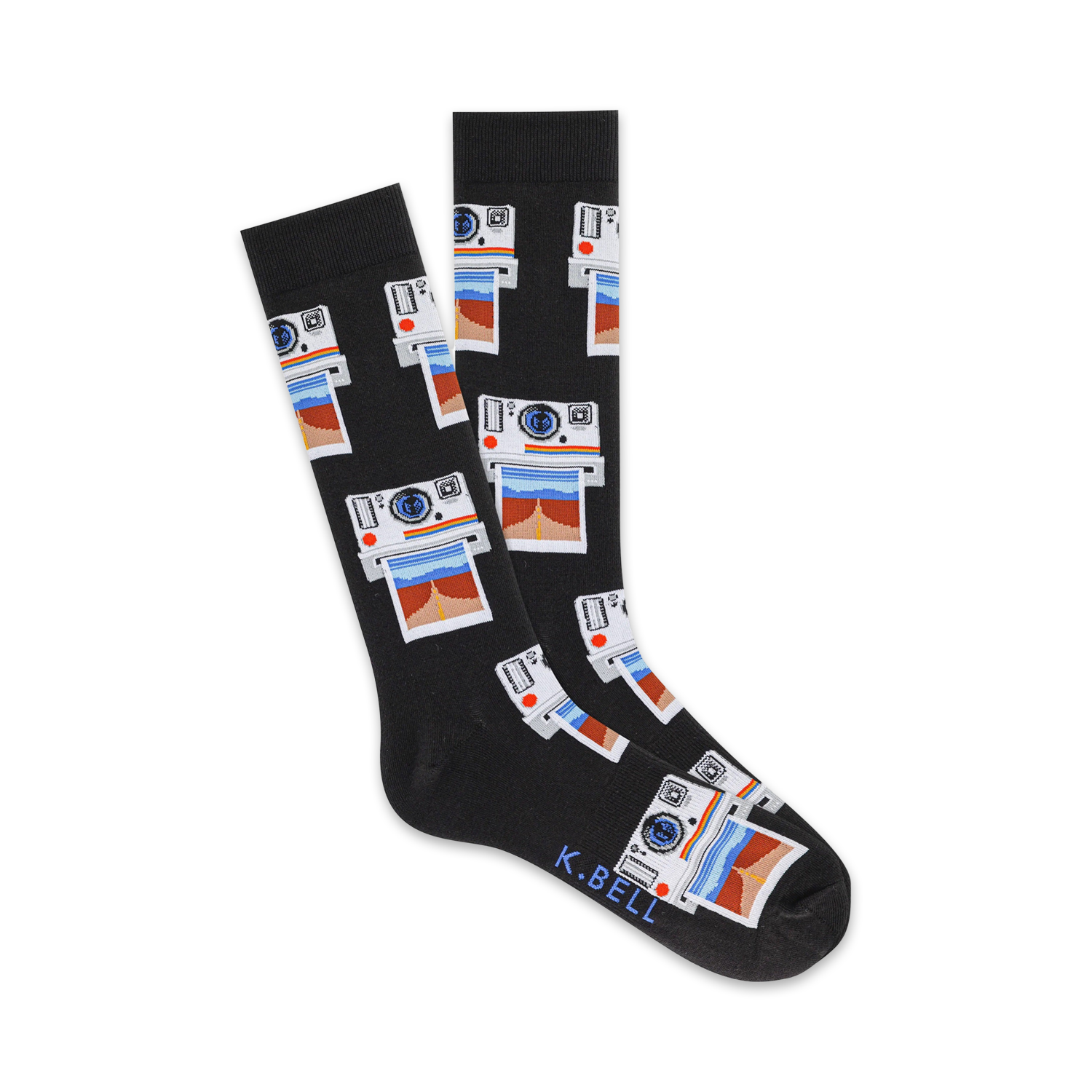 Take a retro trip with these Vintage Camera Photos Crew Socks for Men! Featuring a pattern of classic Polaroid cameras in white and blue, each with a photo of a majestic mountain landscape, these socks tell stories of outdoor adventures. Wear them to capture memories in style or gift them to a fellow photography enthusiast.