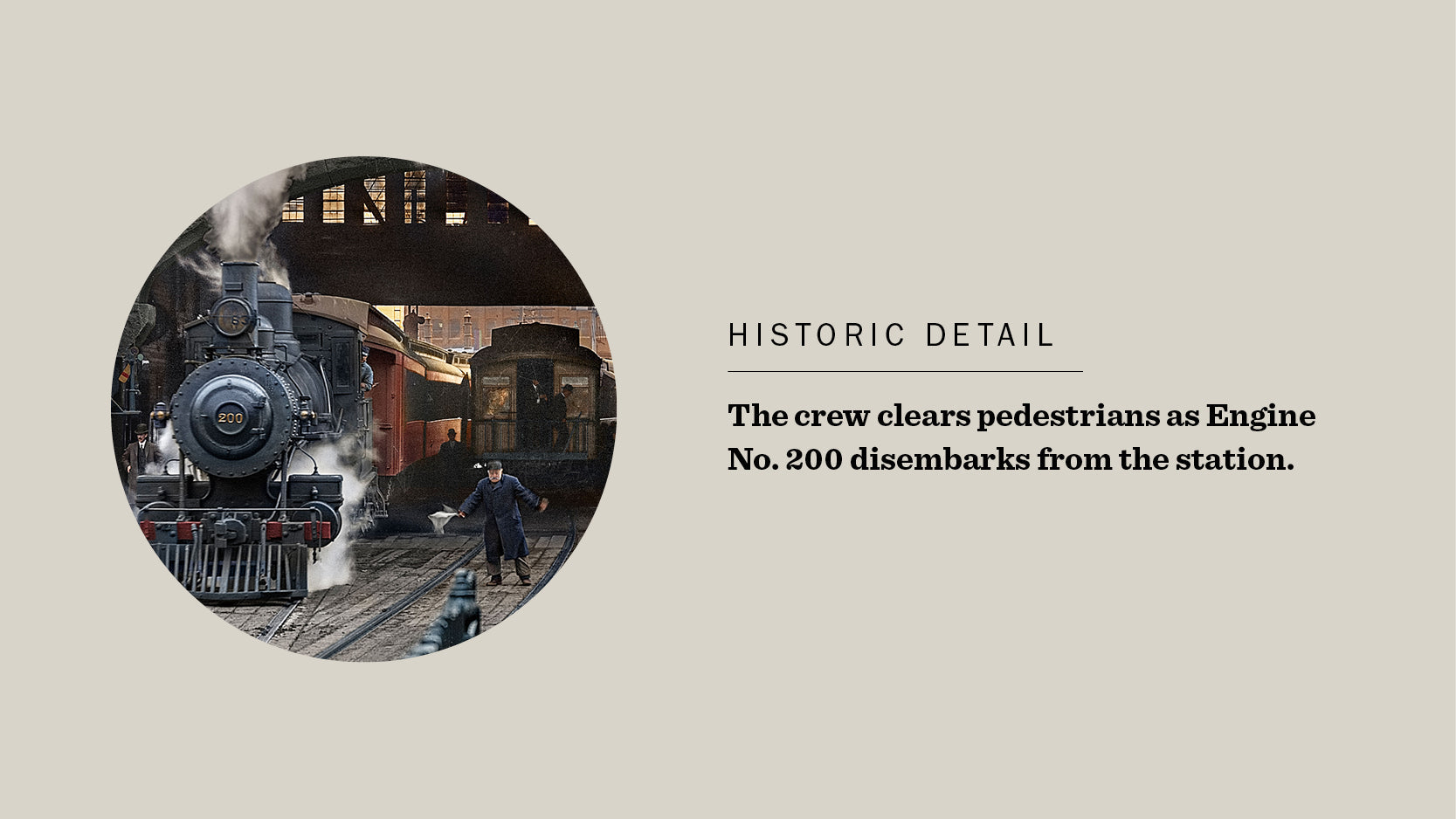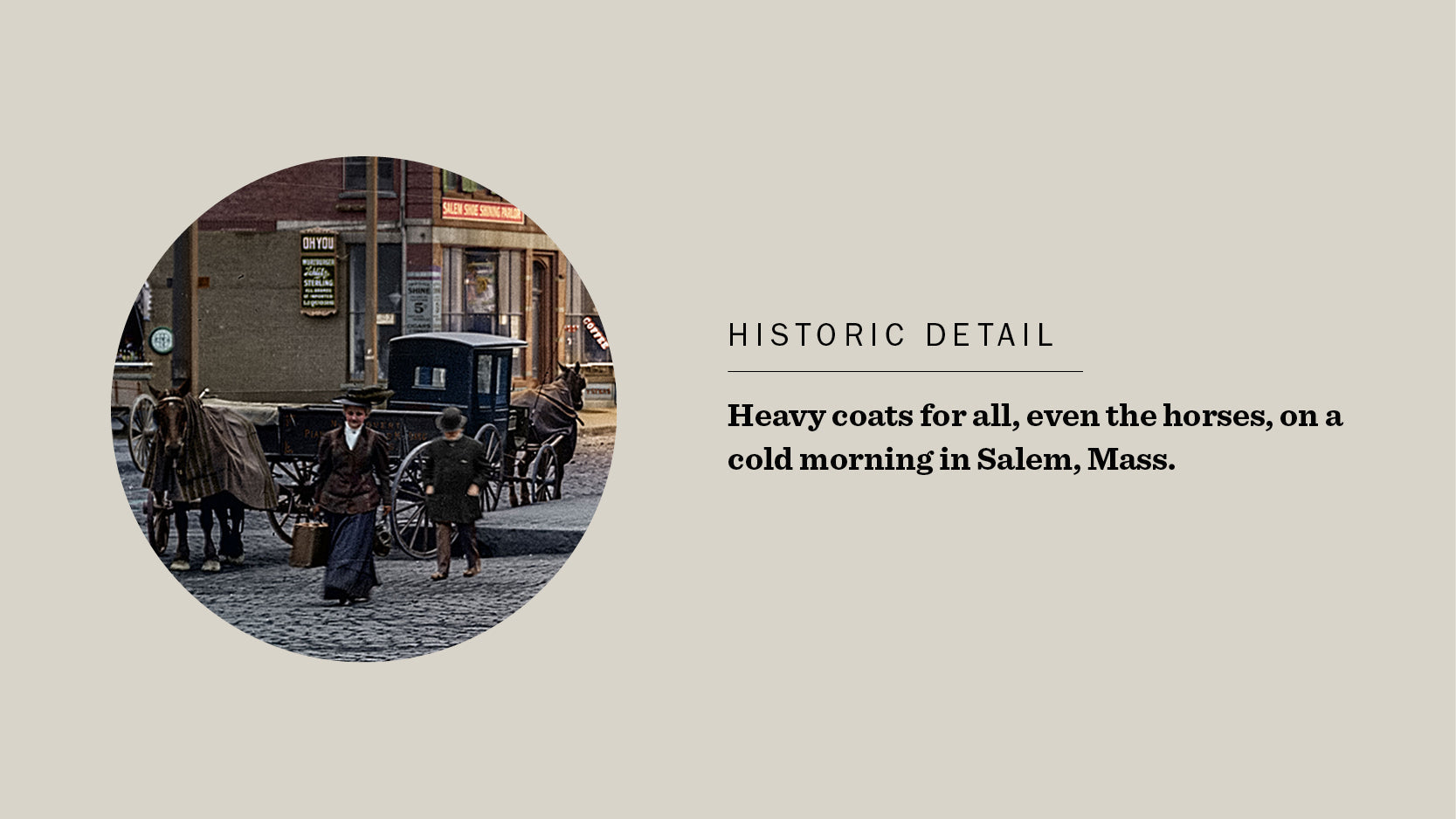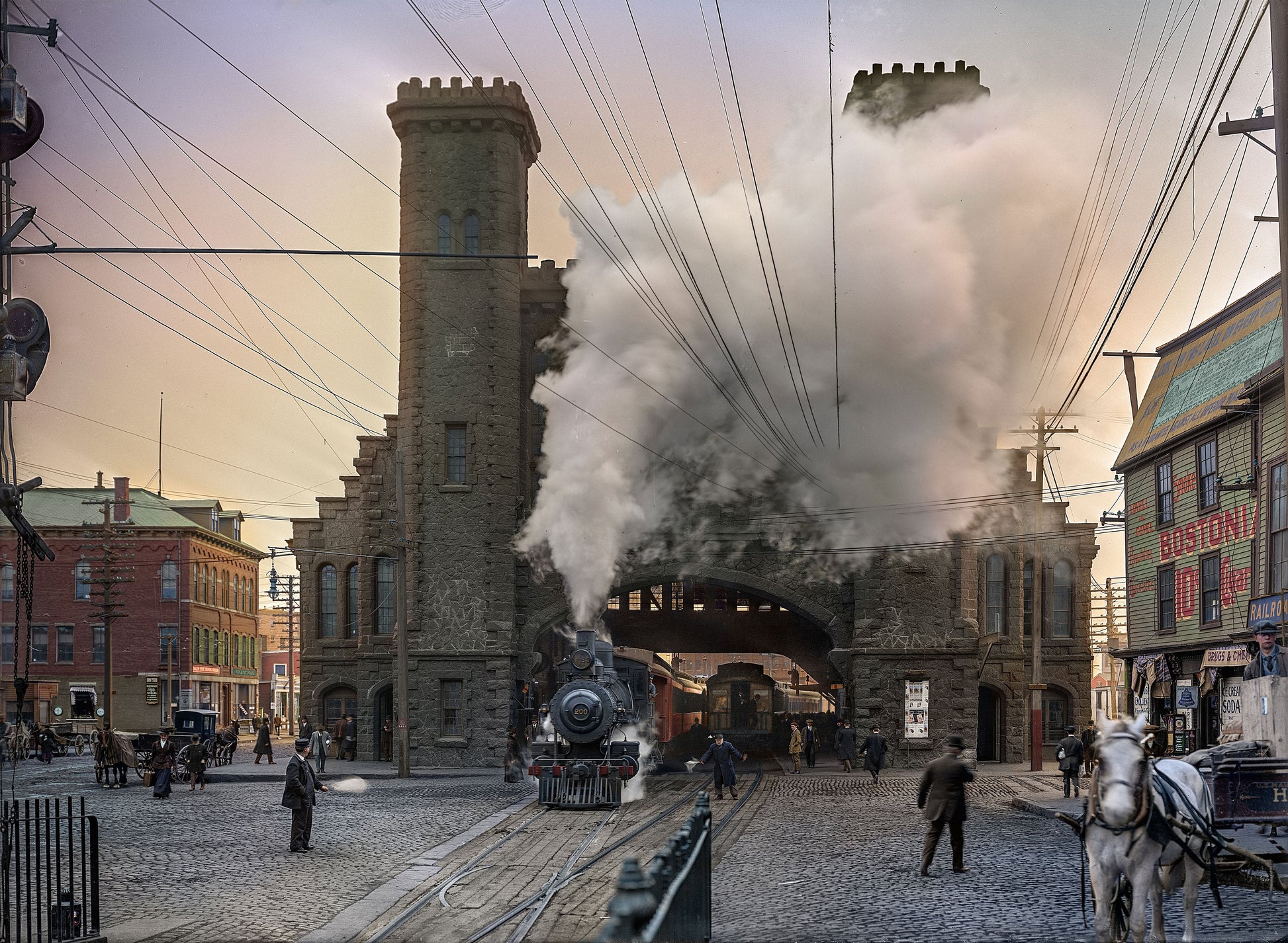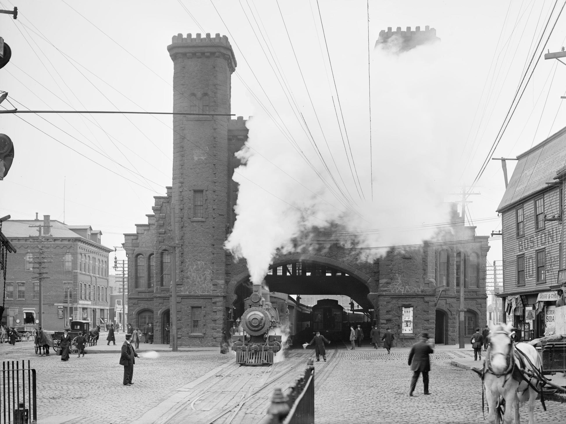 Riley Plaza, in Salem, Massachusetts, atwitter with activity on a chilly morning as the sun rises behind a Boston and Maine Railroad engine leaving the depot, circa 1910. Library of Congress, LC-D4-39498