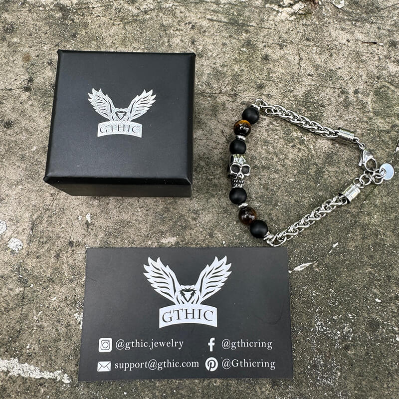 Step into the realm of sophistication with our Vintage Skull Tiger Eye Stainless Steel Bracelet. Merging vintage charm with contemporary flair, this bracelet exudes timeless elegance that captivates attention. Each tiger eye bead is meticulously selected for its rich, earthy tones and unique patterns, creating a striking contrast against the intricate skull accents. Elevate your wrist game with a statement piece that speaks volumes about your distinctive taste and individuality.