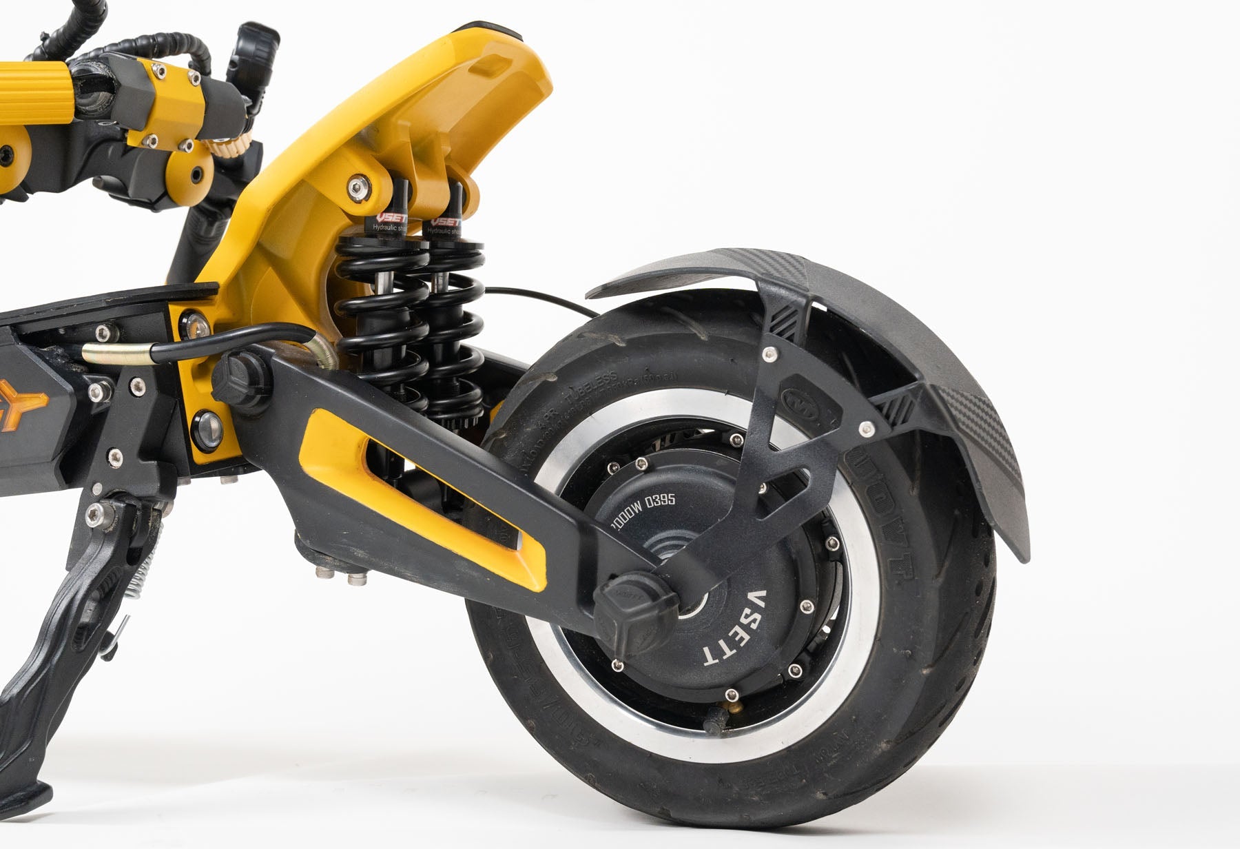 The 11+ touts dual 2,000 w motors and a 72 volt 35 amp hour battery can get you a practical range of 60 miles. Like its little siblings the 11+ has dual suspension, though this has been upgraded as well with two hydraulics in back and one in the front. The tires are bigger too, going from 10 by 3 in the 10+ to a hefty 11 by 4 in the 11+