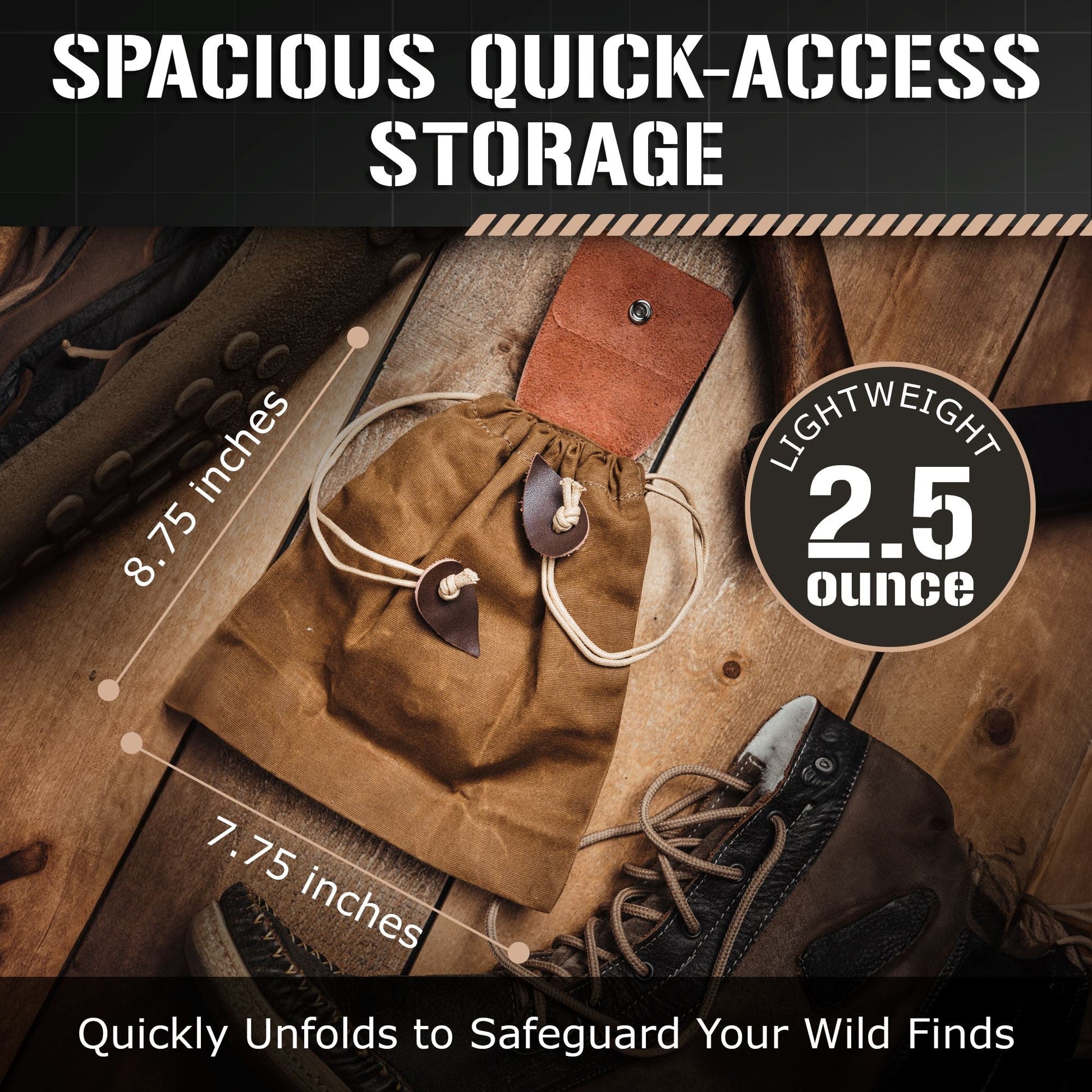 - COMPACT & AMPLE STORAGE - This spacious bushcraft bag with a secure drawstring closure will securely store your foraged treasures, bushcraft gear, hiking essentials, or emergency supplies on the go. Compact when folded and stored on your belt, and big enough for all of your foraging needs when opened up.