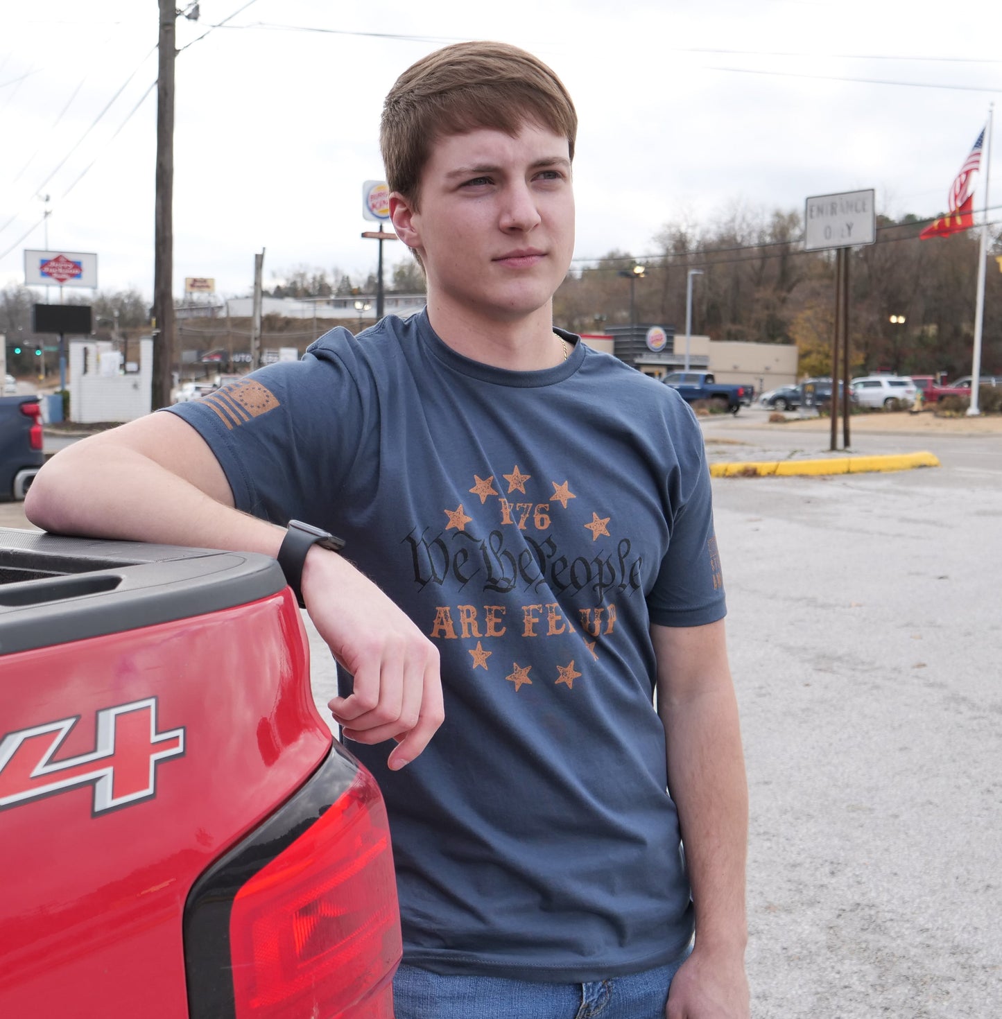 - Sleeve accents: Steadfast American logo on one sleeve and the Betsy Ross flag on the other