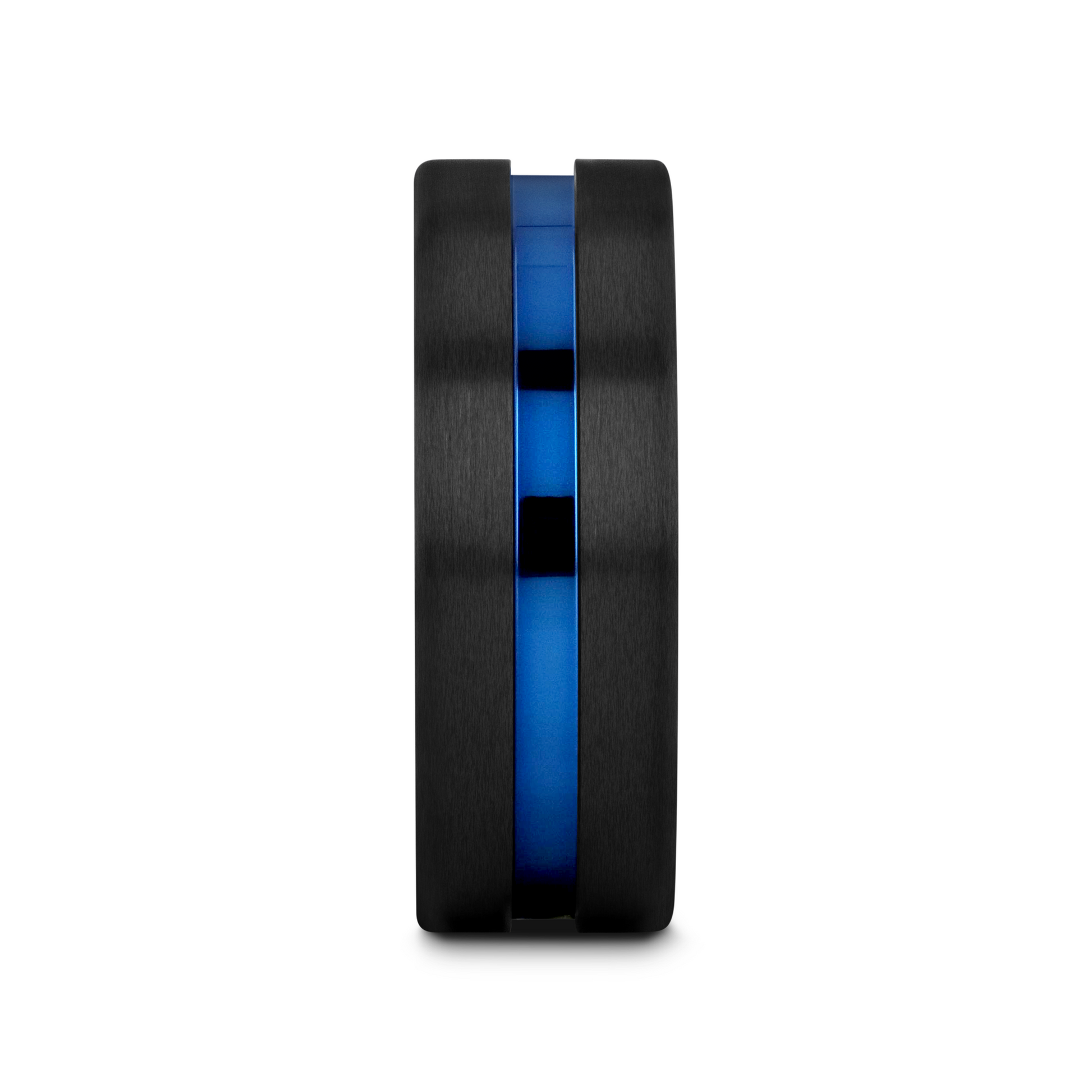 WESTLEY Flat Brushed Finish Black Ceramic Men’s Wedding Ring with Blue Grooved Center - 8mm