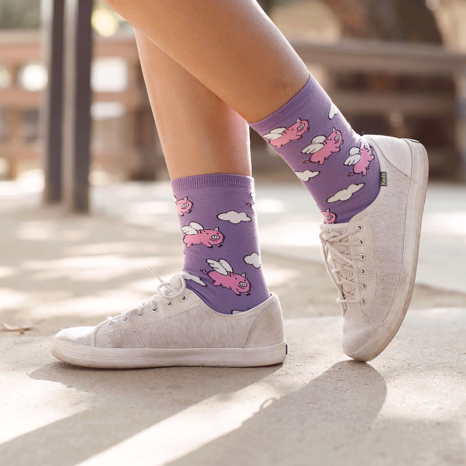 Flying pigs are so cute! Wear them on your feet and show everyone just how adorable they are. Each awesome women's novelty crew socks feature winged pigs flying around some clouds printed all over against a light blue background.