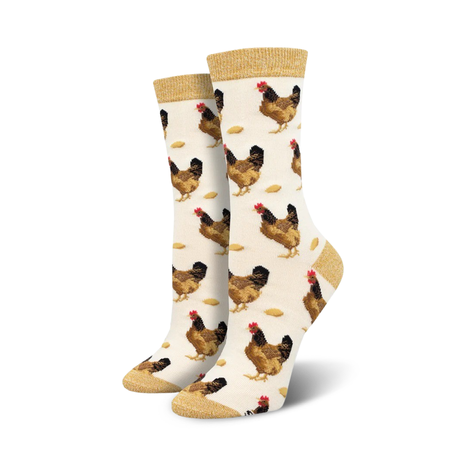 Unleash your inner chicken enthusiast with our "Which Came First? Bamboo" socks! These crew-length socks for women feature a whimsical pattern of brown hens and white eggs on a cream-colored background, topped with a golden touch. Embrace the age-old debate in style and show off your love for all things poultry. Prepare to have egg-cellent adventures and leave everyone clucking with laughter!