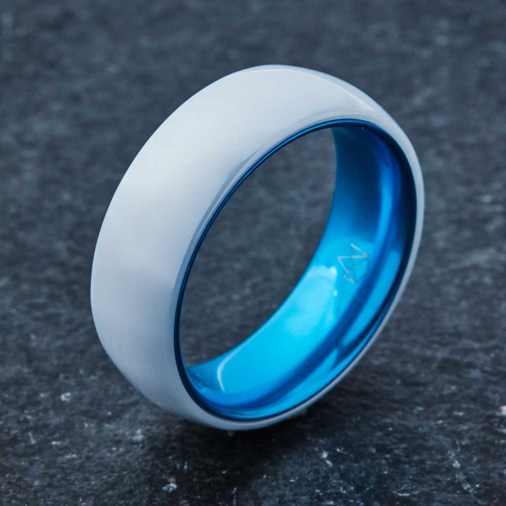 The process of creating the stunningly bright blue interior begins with a singularly piece of space grade aluminum which is then anodized with a protective oxide honeycomb layer. The ring is then introduced to a single component dye that is absorbed by a capillary effect to ensure maximum saturation of color, while actually becoming part of the ring's surface itself.