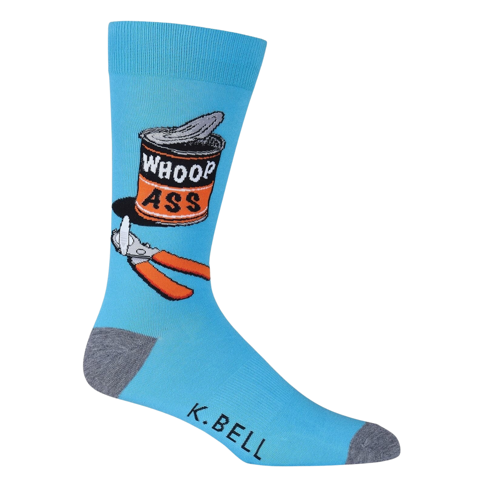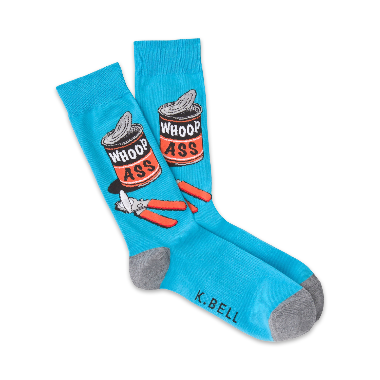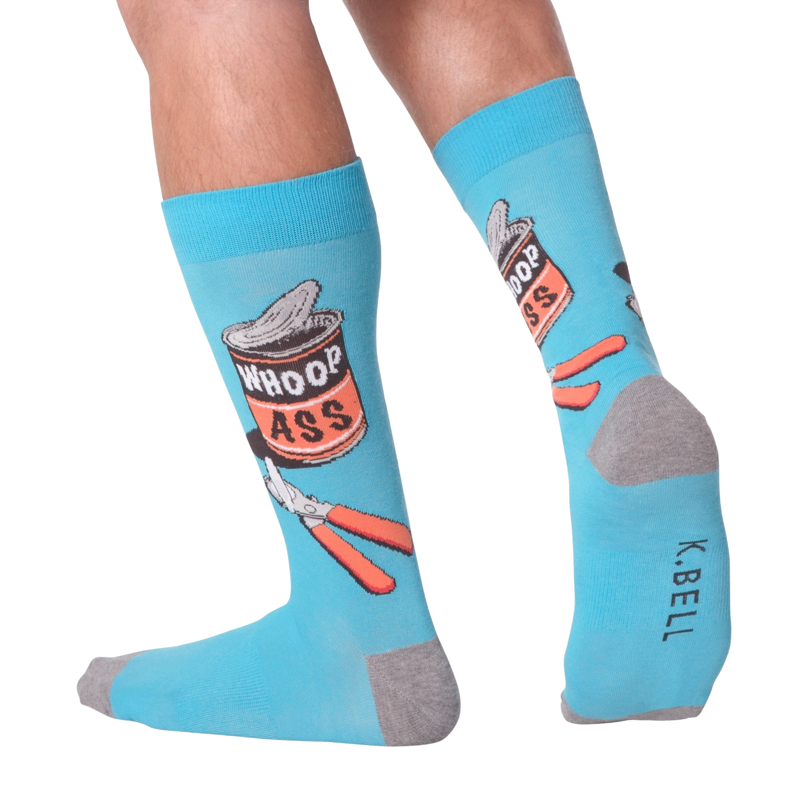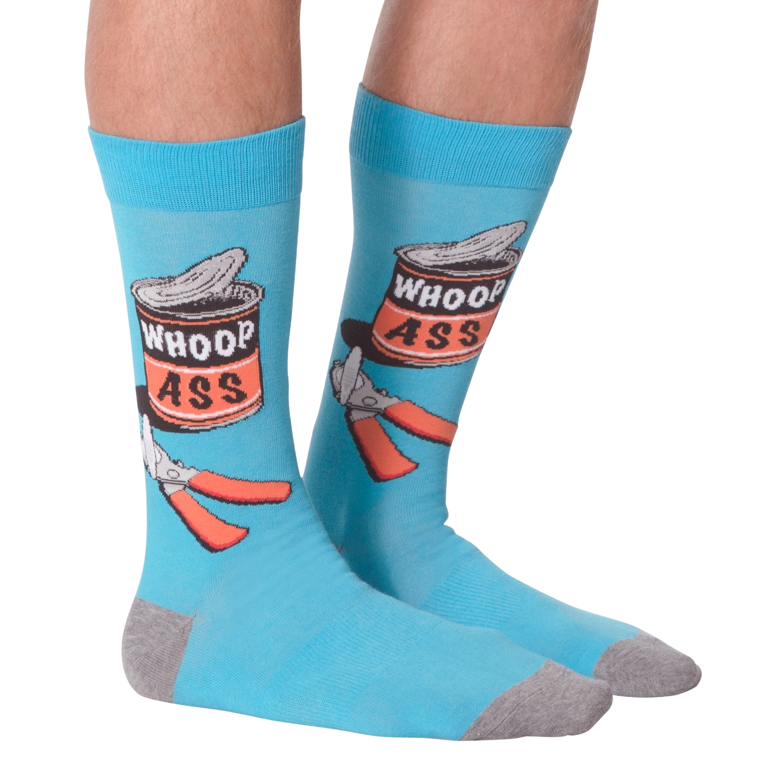 No matter what has you down, sometimes you need to reach for a big can of Whoop Ass, crack it open, and press on! This funny pair of blue and gray crew socks features an open can of "whoop ass" with a can opener in front of it. Let everyone be warned with this cool yet silly pair of socks.