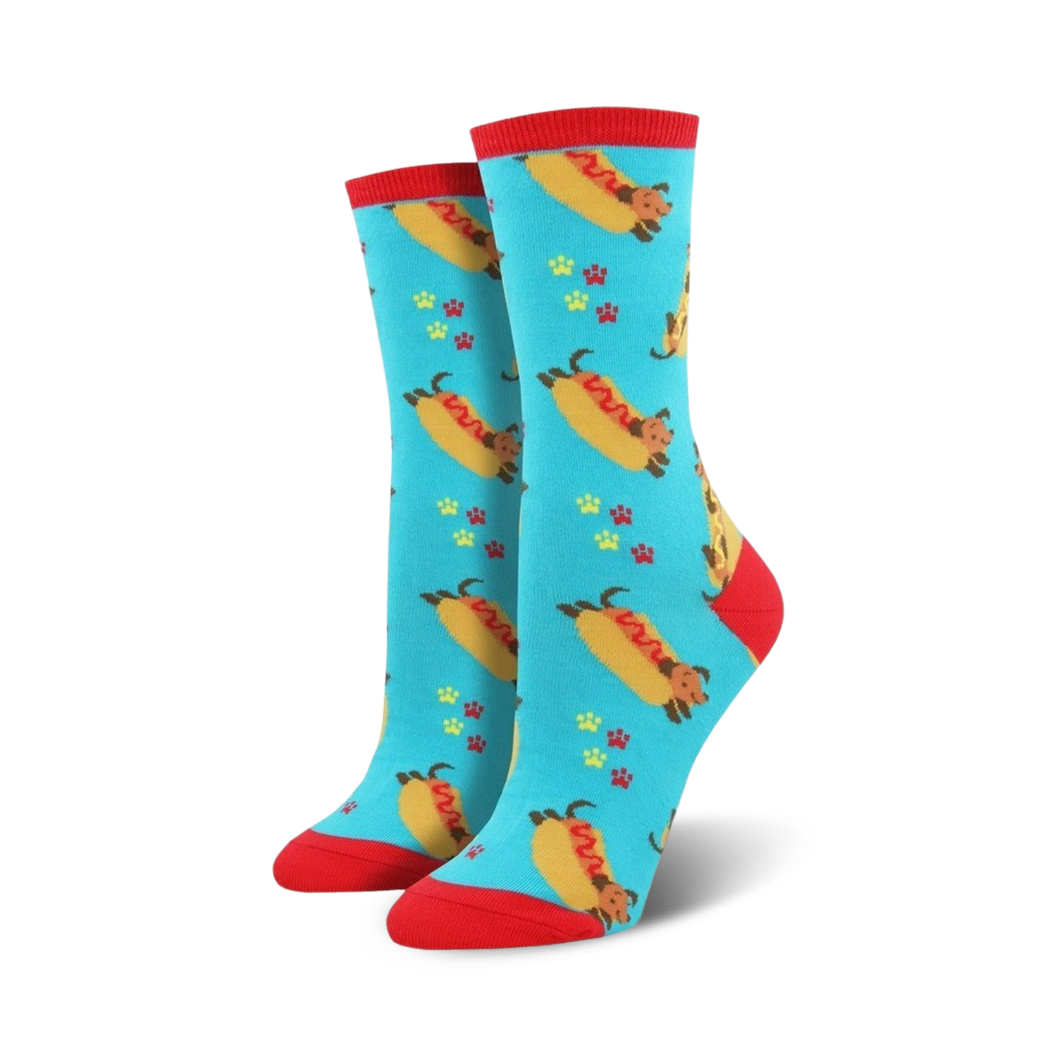 Do you love Dachshunds? Or just enjoy a nice juicy hot dog loaded with toppings? Well, either way, these adorable wiener socks are sure to please! Each awesome pair of women's novelty crew socks have cute Dachsunds sandwiched between hot dog buns printed all over against a light blue background. The cuffs, heels, and toe lines are red.
