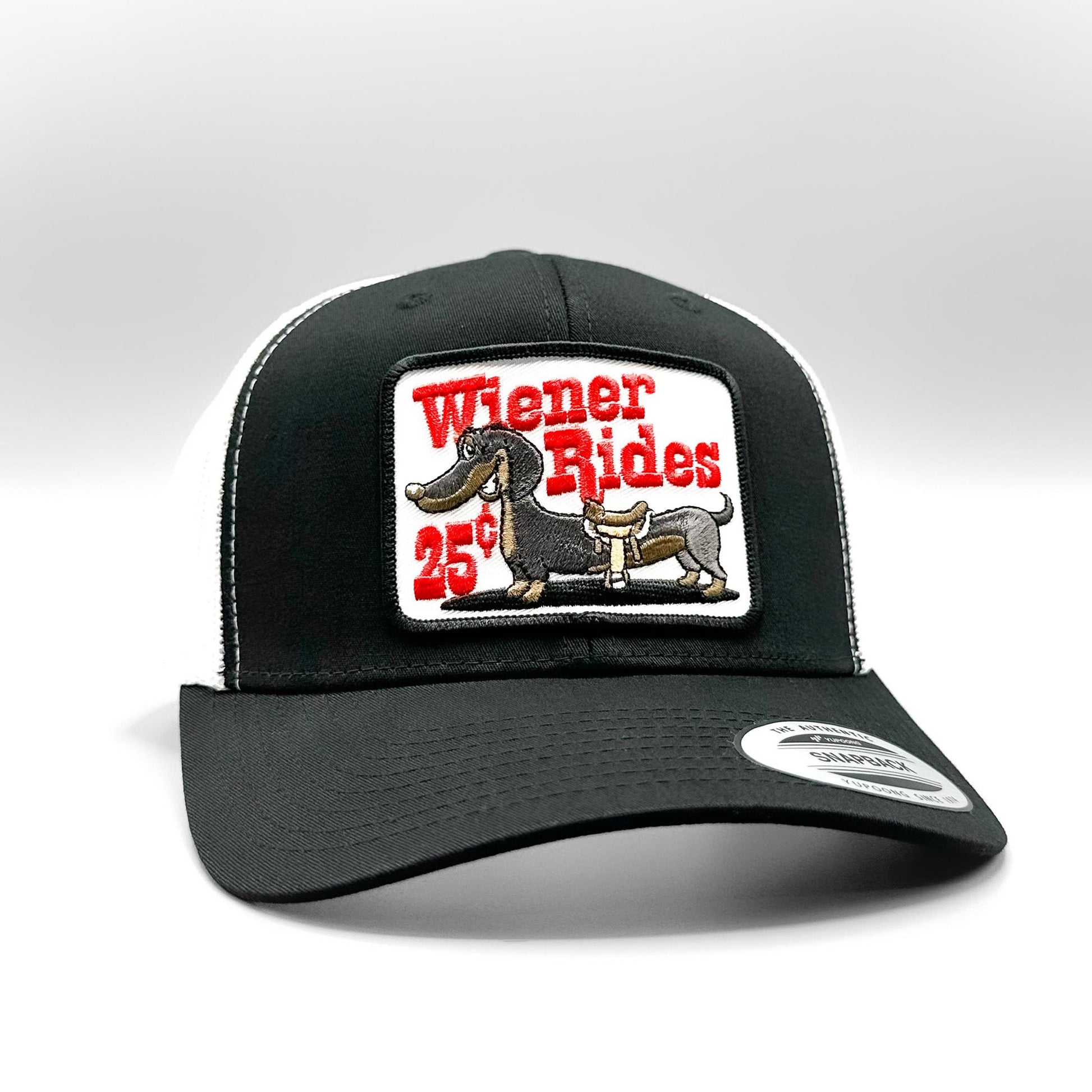 Baseball style black with white mesh curved bill unisex trucker hat with dachshund Wiener Rides 25 Cents embroidered patch on a mid-crown Yupoong 6606 six-panel snapback mesh baseball cap. This is a hat ideal for small to medium sized heads.