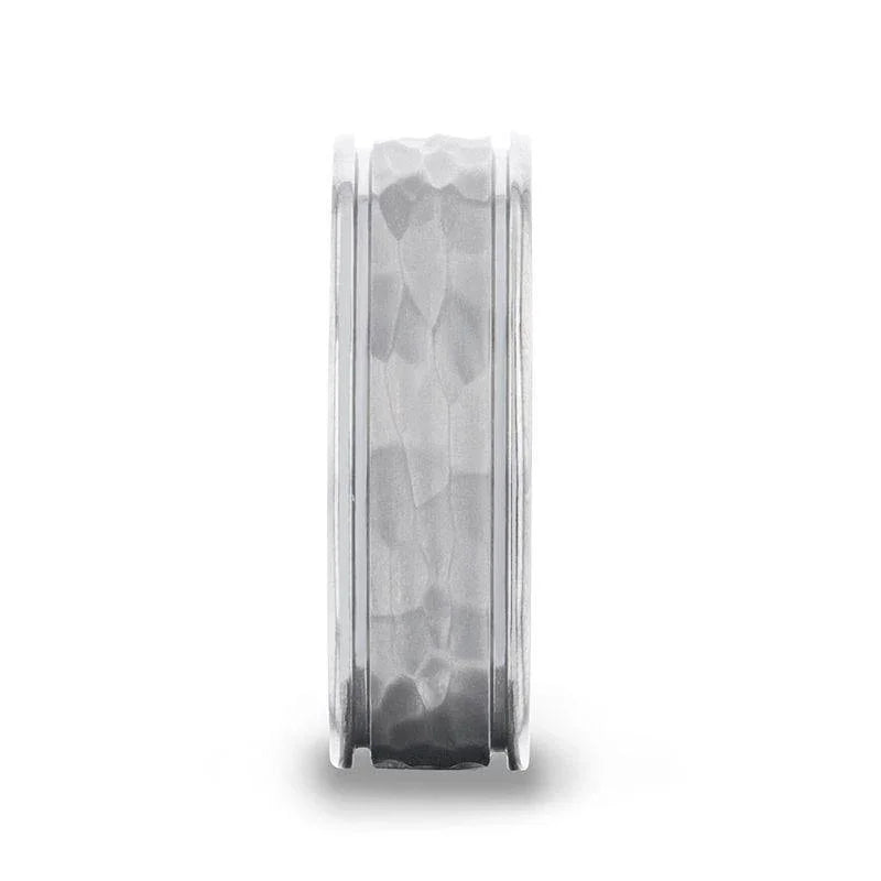 WILLIAM Hammered Finish Center White Titanium Men's Wedding Band With Dual Offset Grooves And Polished Edges - 8mm