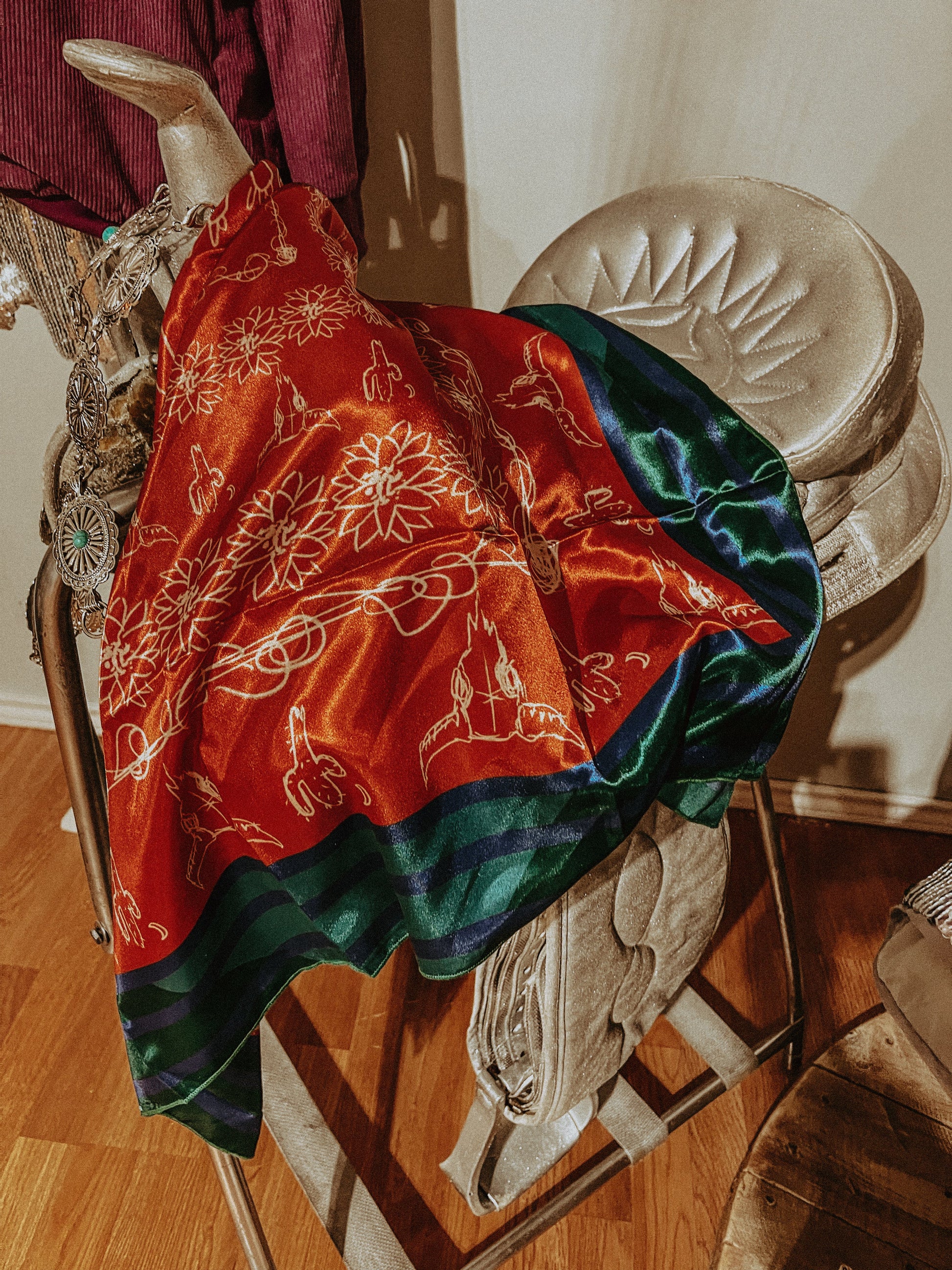 This scarf measures approximately 36x36 inches, made of 100% polyester. The design embodies the brand's signature roughhouse style, perfect for those seeking a unique and rowdy accessory. Enjoy the versatility of this piece, use it as a neck accessory or a head wrap. Add some rowdy to your wardrobe with this must-have piece.