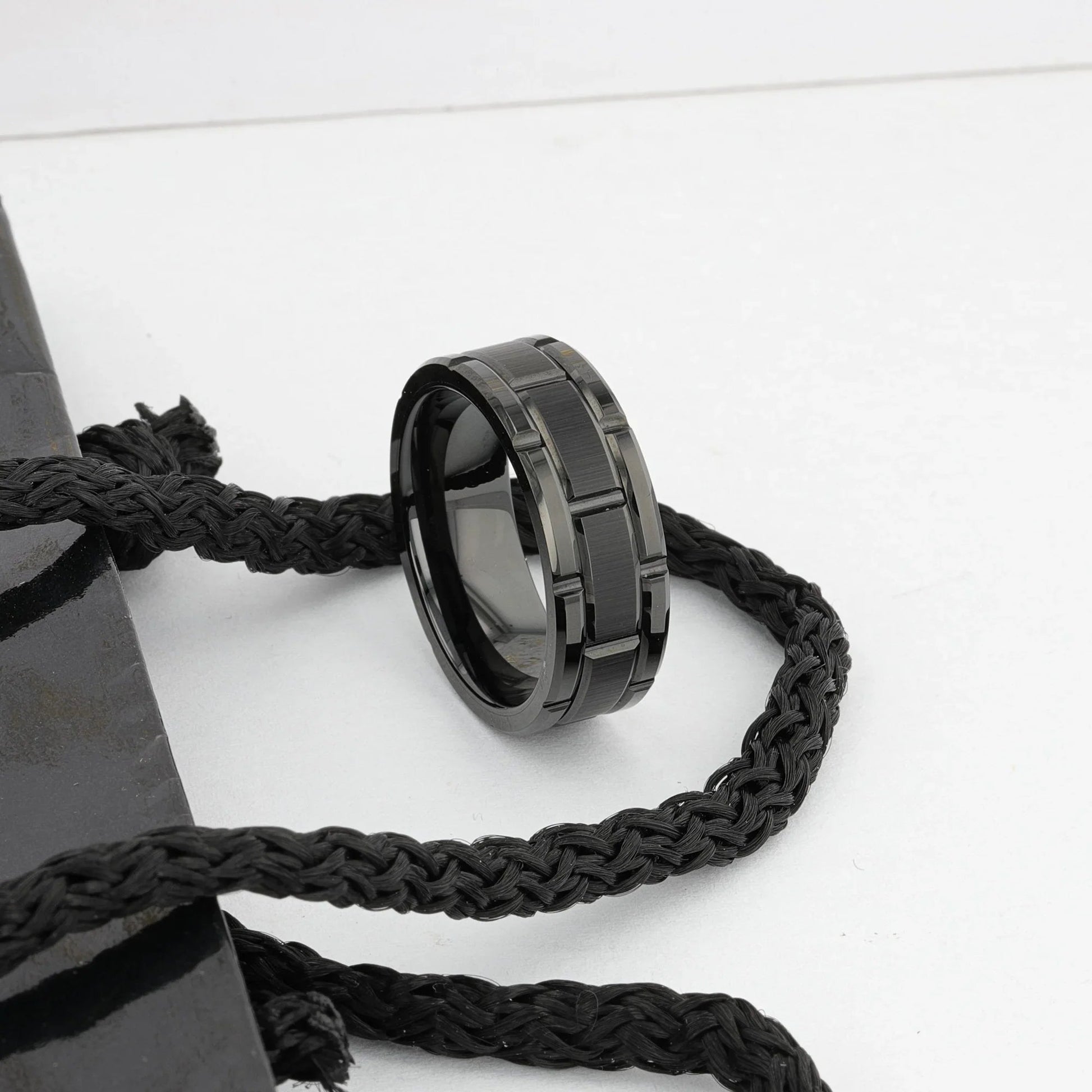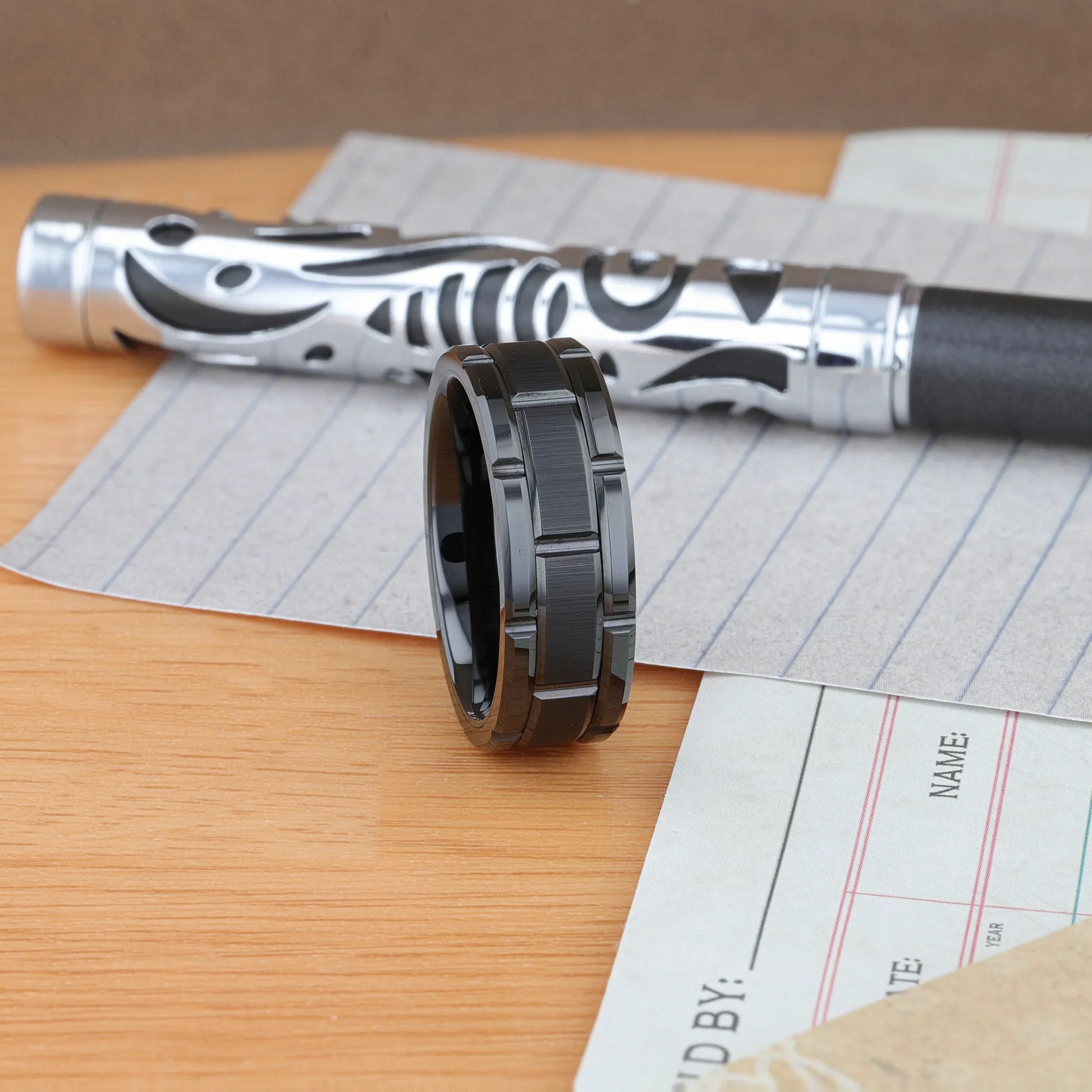 This remarkable, attention-grabbing Black Tungsten Carbide ring design from Thorsten features a beautiful vertically-brushed finish on the center band flanked with carved side band segments with polished beveled edges and can be worn as a wedding band or promise ring.