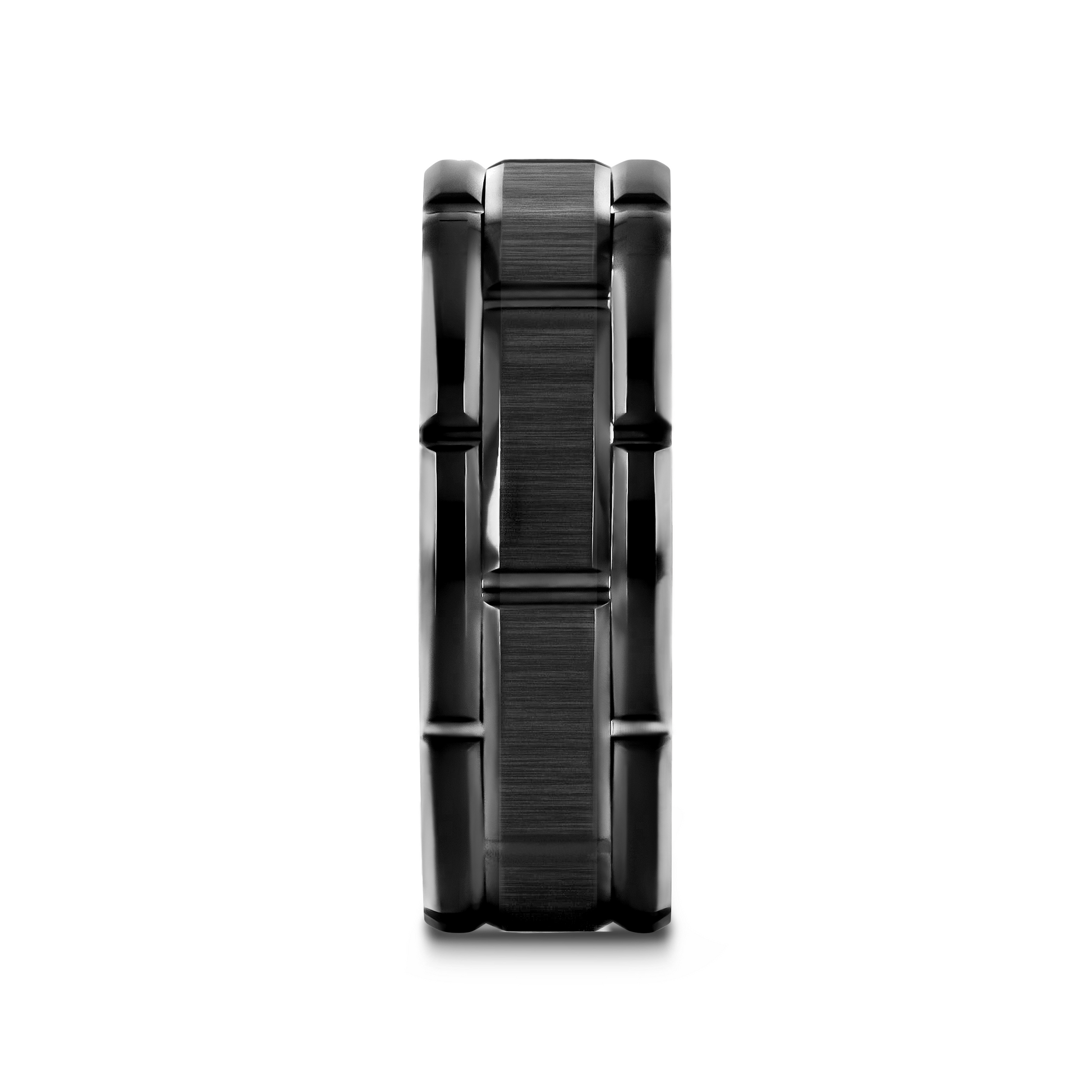 WINDSOR Beveled Black Tungsten Carbide Wedding Band with Brushed Center and Alternating Grooves – 8mm & 10mm