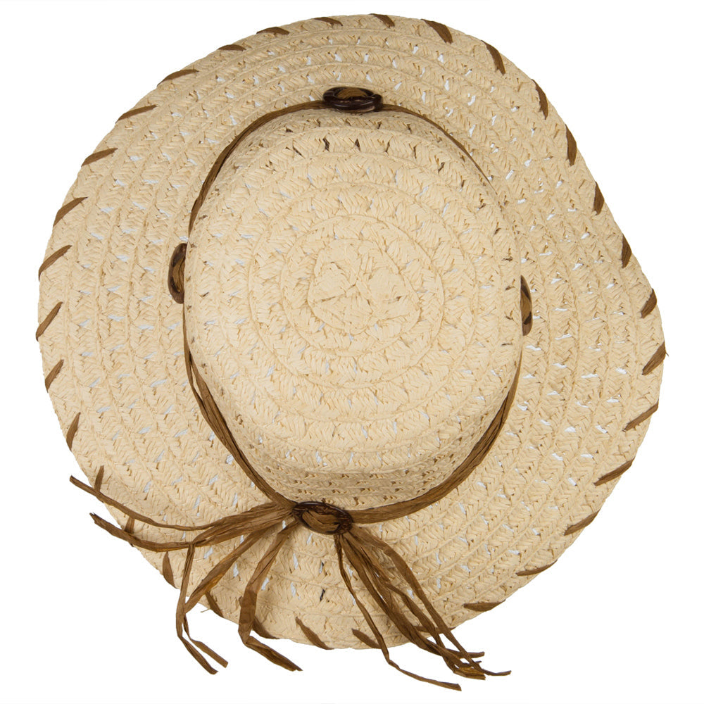 Design Detail, Features a self-tie with coconut buckle accents around the crown