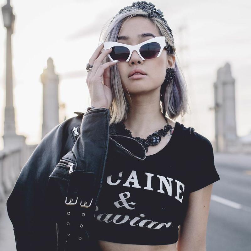 - Designer inspired eye-catching cat eye silhouette sunglasses that features a semi-rimless frame. These amazing cat eye frame creates a very chic and dramatic look this season. Made with a plastic based frame, metal hinges, and UV400 protected polycarbonate lenses.