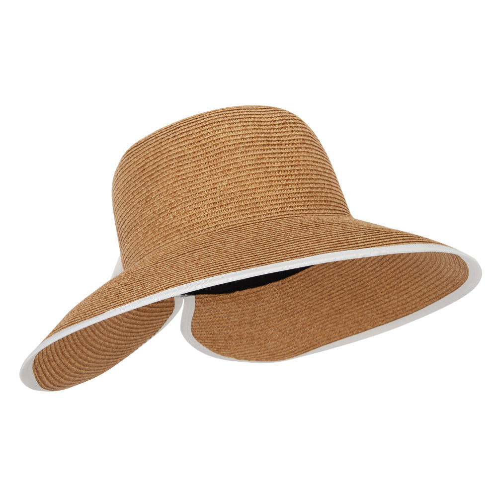 Material Composition, Women's Paper Braid Bow Accented V-Cut Split Wide Brim Bucket Hat is made of 75% paper and 25% polyester.