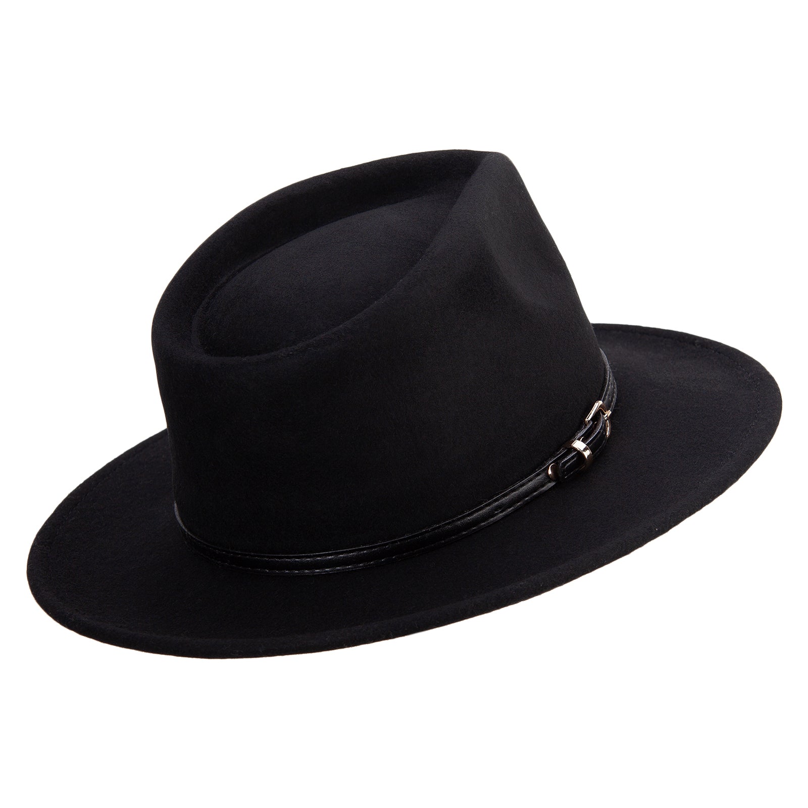 Design, Stiff brim with a sewn band, pinched fedora crown with an elastic tie