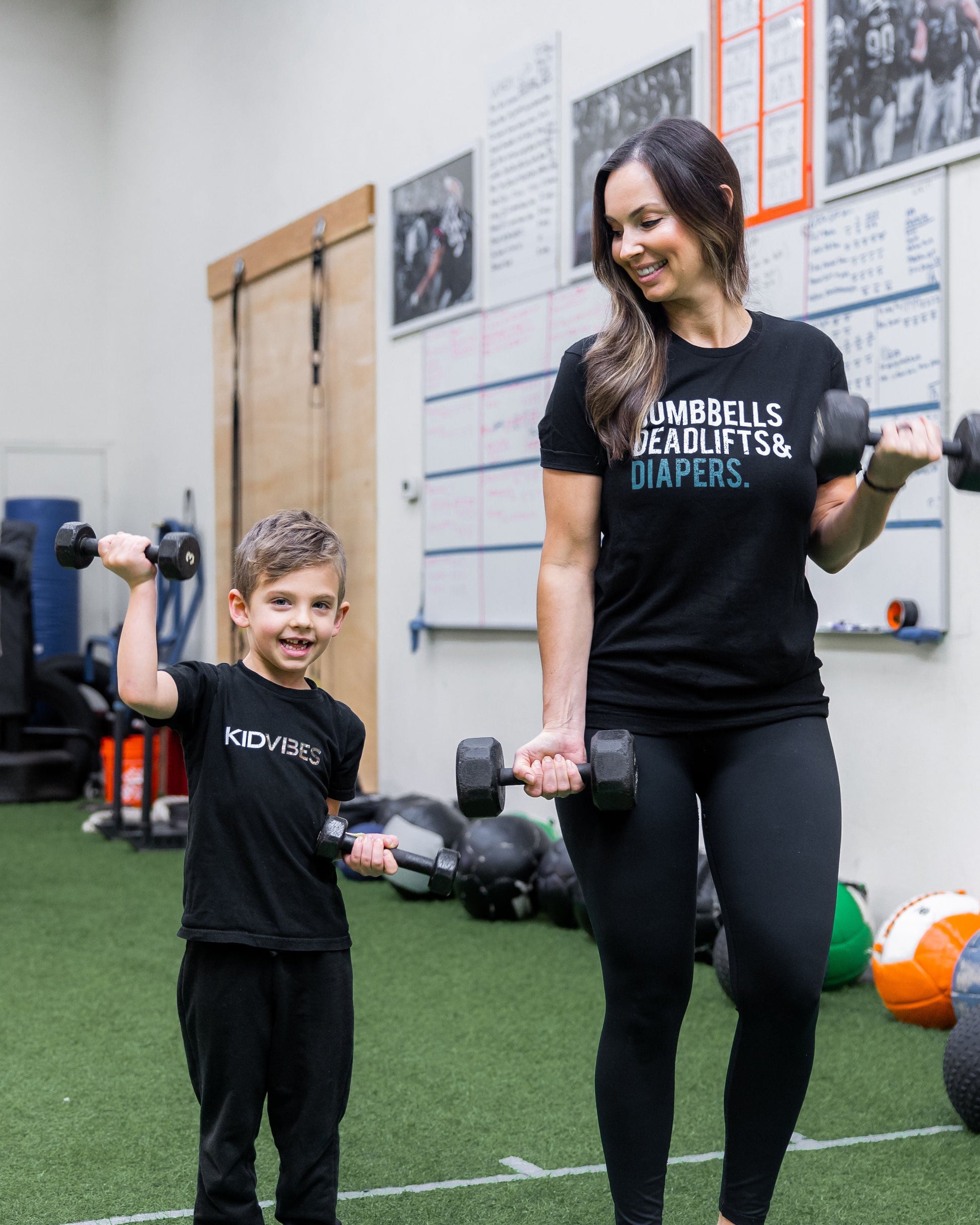 - Dumbbells, Deadlifts and Diapers print printed on front