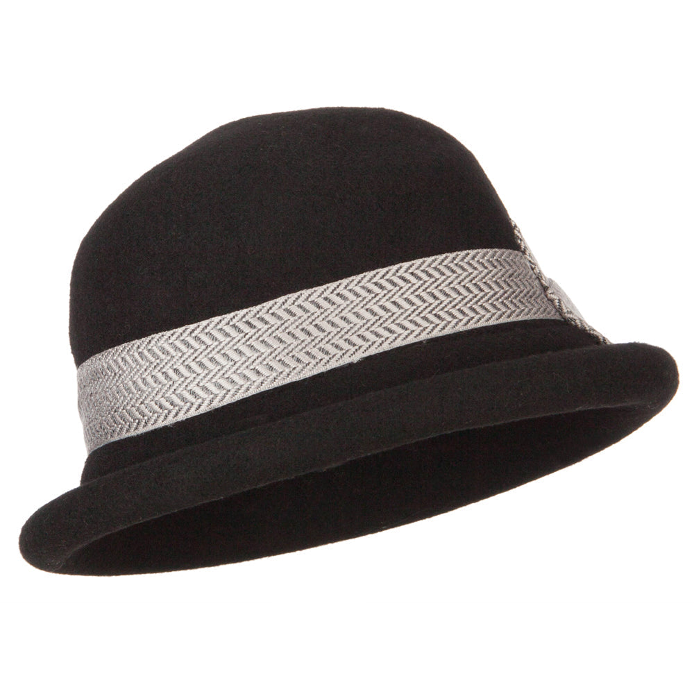 Women's Wool Felt Herringbone Design Ribbon Accented Rolled Up Brim Bucket Hat