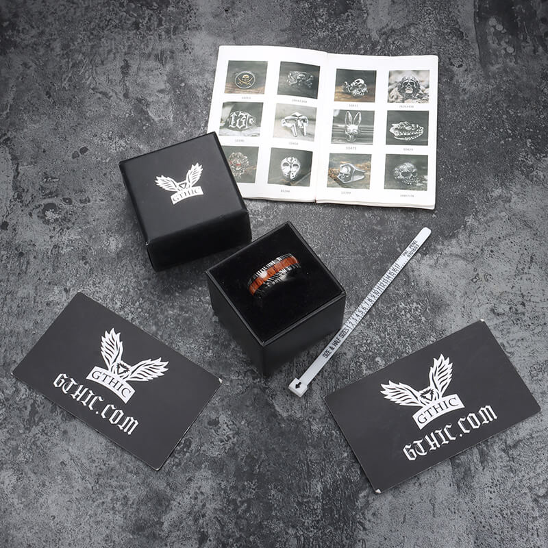 This is a minimalist-style stainless steel ring. Wood grain is attached to the ring. Wood grain is an element that is very close to nature and is deeply loved by the public. The metal material is Damascus steel which is a famed type of steel recognizable by the watery or wavy light and dark pattern of the metal. Damascus steel rings are more resistant to rust. It is a great engagement ring for your lover.