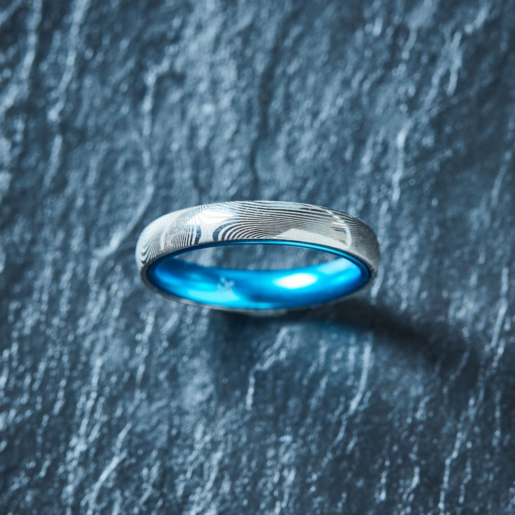 Wood Grain Damascus Steel Ring - Resilient Blue - 4MM