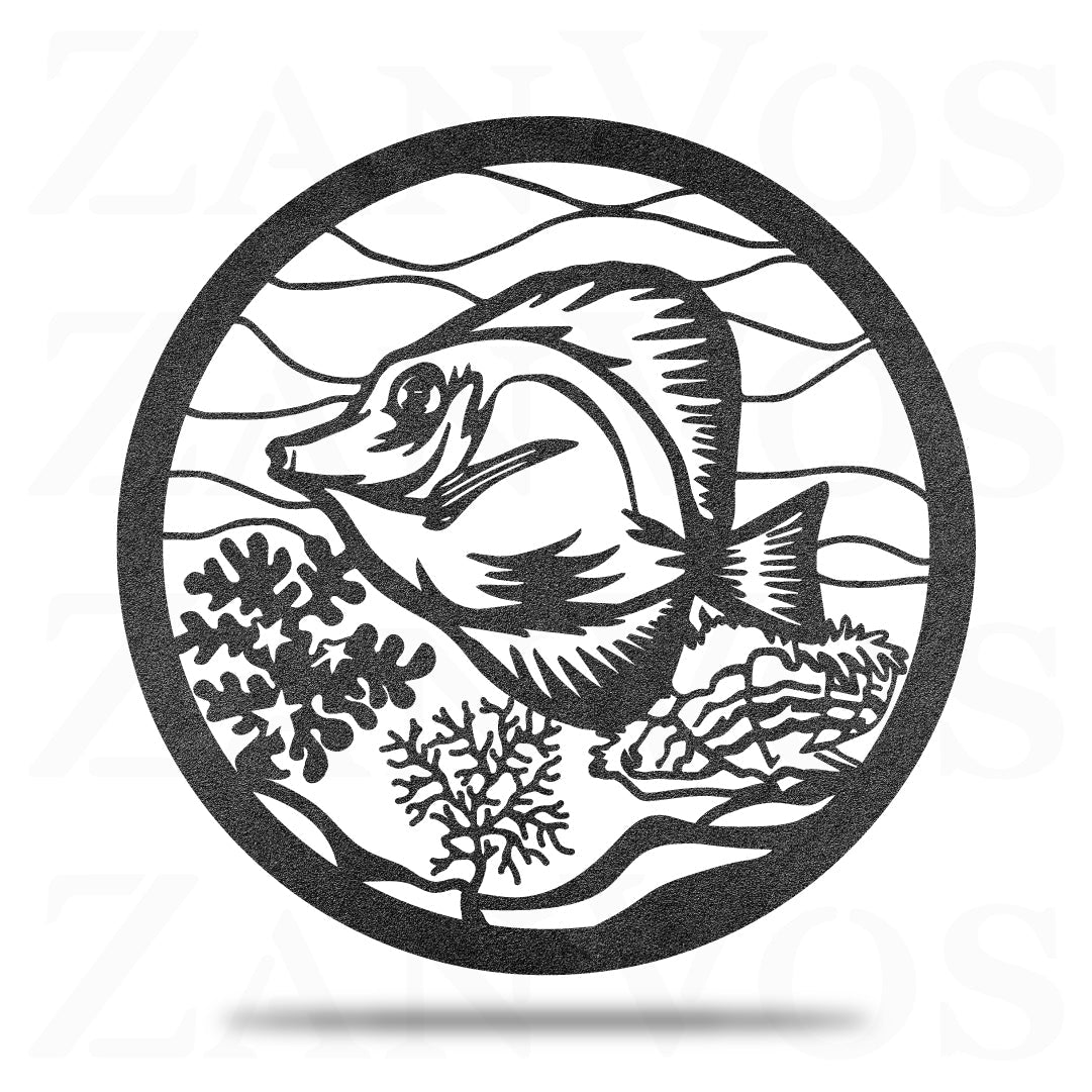 This circular metal art piece is crafted from durable 16 gauge steel with a powder-coated finish, featuring a vibrant yellow tang fish in its natural habitat. Its detailed design and sturdy construction bring a lively, ocean-inspired accent to your wall decor, perfect for adding color and life to any space.