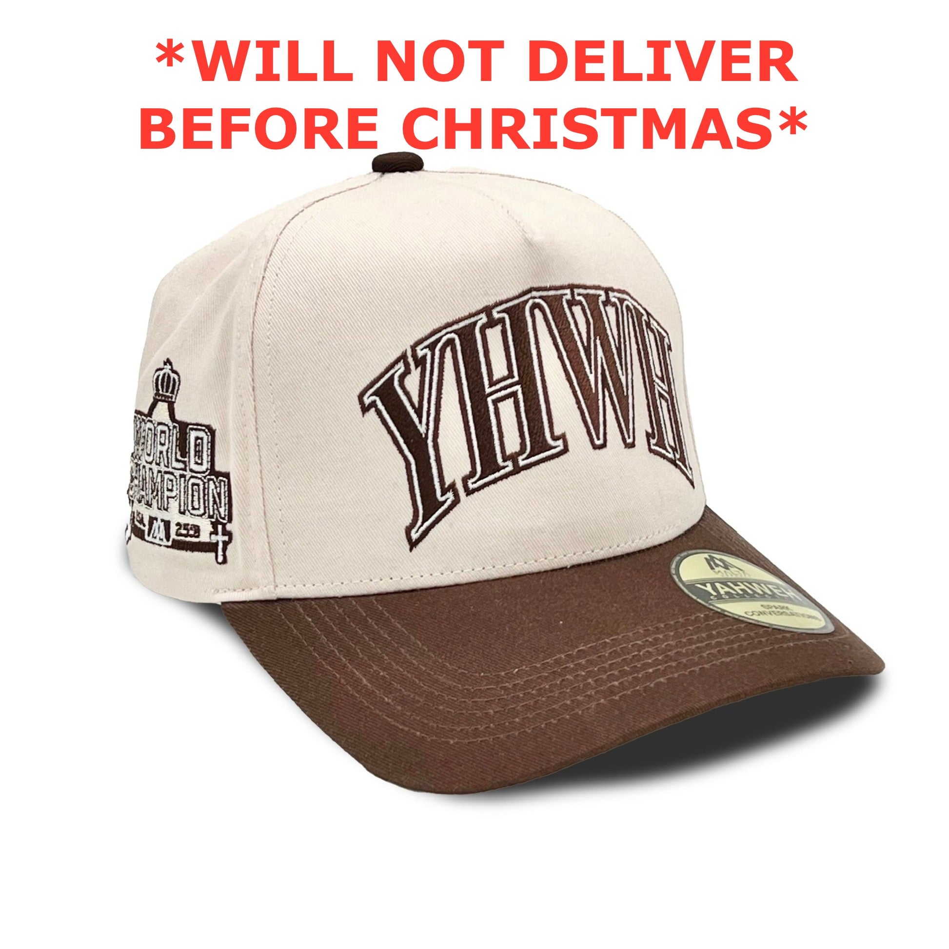 Cream/Brown colorway with YHWH front embroidery, "World Champion” right side panel embroidered patch, Malta “MA” logo embroidery on left side panel.