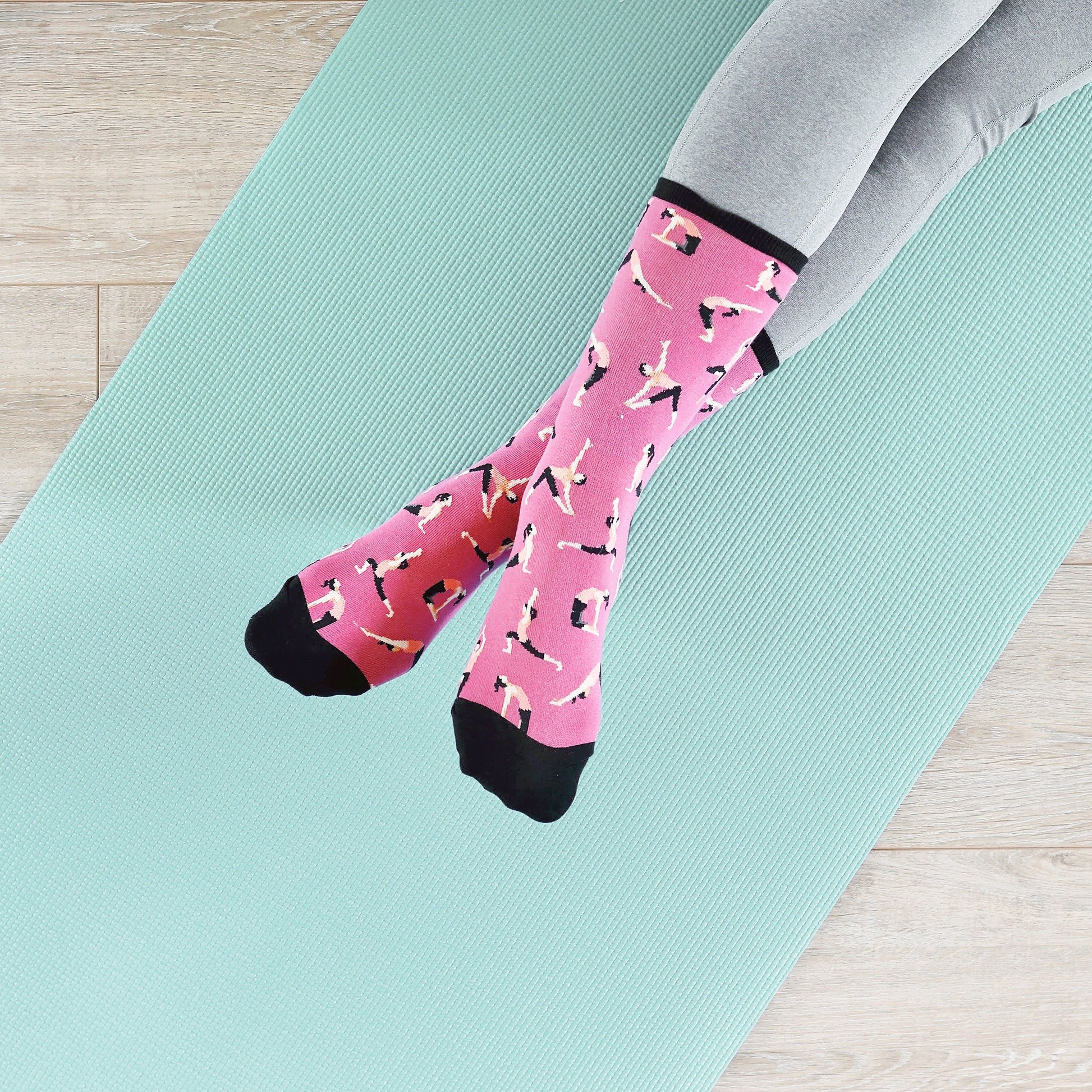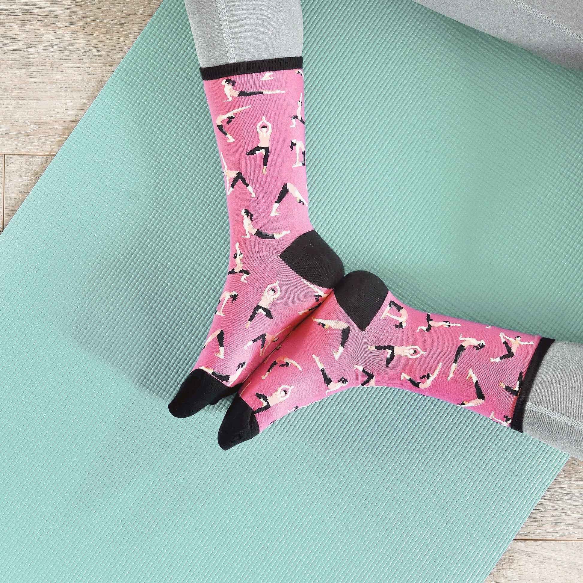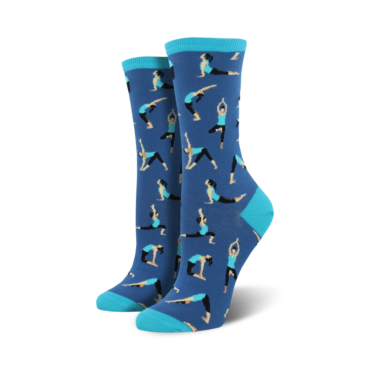 It's no wonder why yoga is so popular. It can help increase flexibility and improve cardio health. It can help you lose weight and reduce stress. If you are a yoga lover, these cool women's novelty crew socks belong in your sock drawer. Each awesome pair features a woman doing different poses printed all over against a blue background.