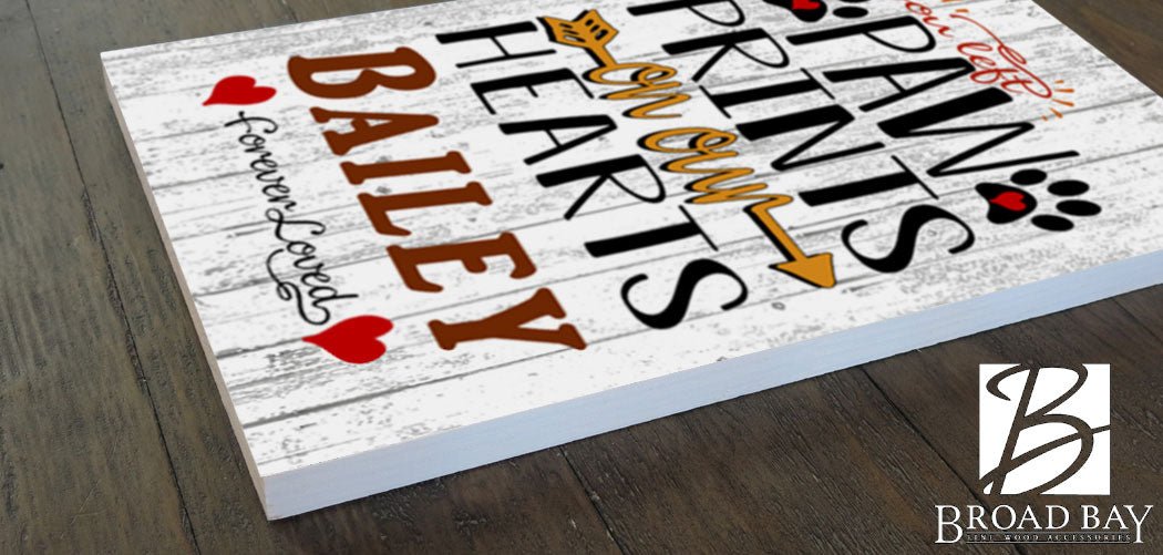 This personalized You Left Paw Prints On My Heart dog memorial sign is a wonderful remembrance to a faithful and loved pet. Personalized with the dog's name this solid wood sign is perfect indoors as a pet memorial. This elegant solid wood pet memorial sign is a wonderful gift for a pet owner that will never forget the love they received from their faithful friend.