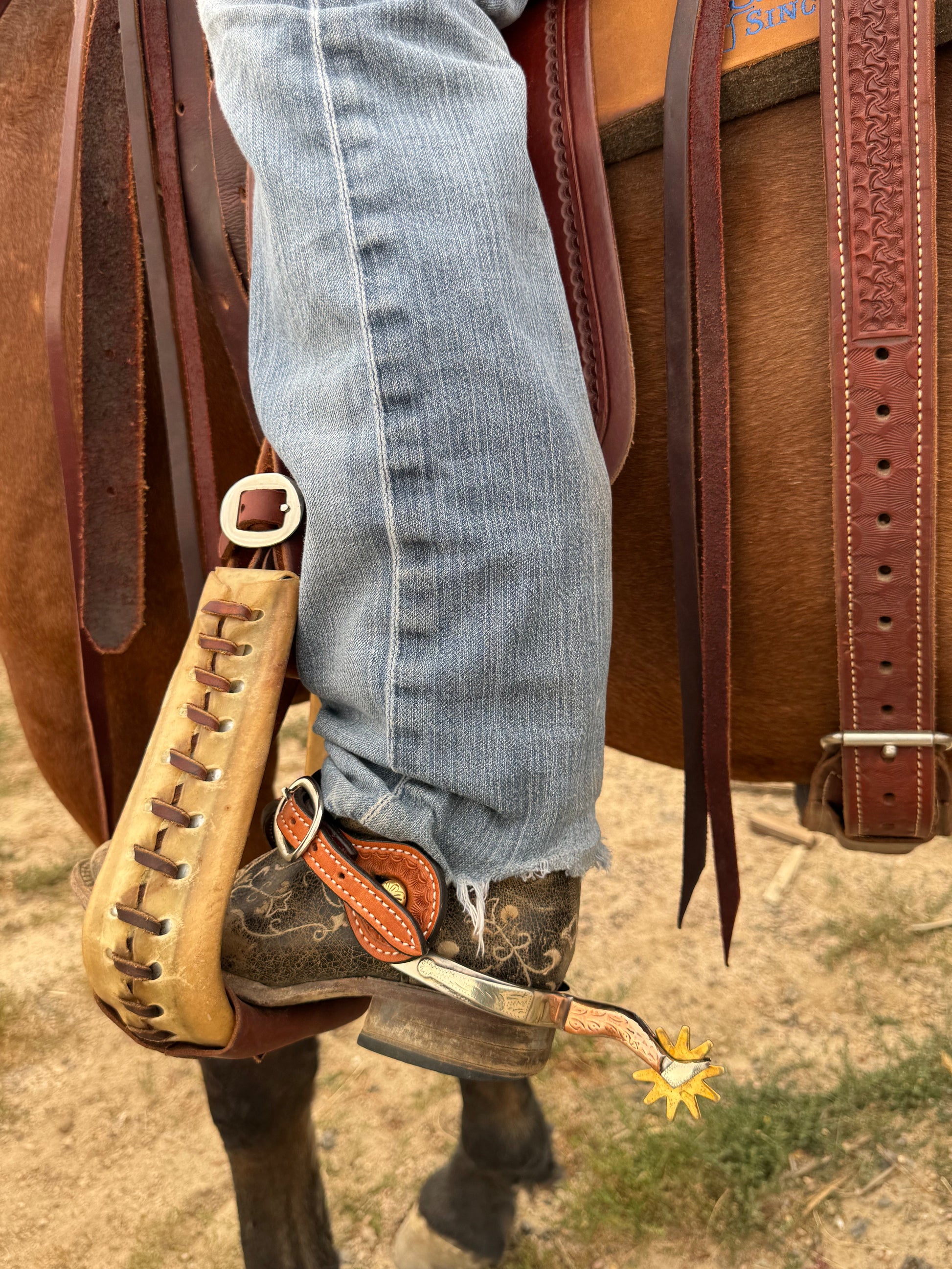 - A stainless steel spur with engraved nickel silver and brass overlay